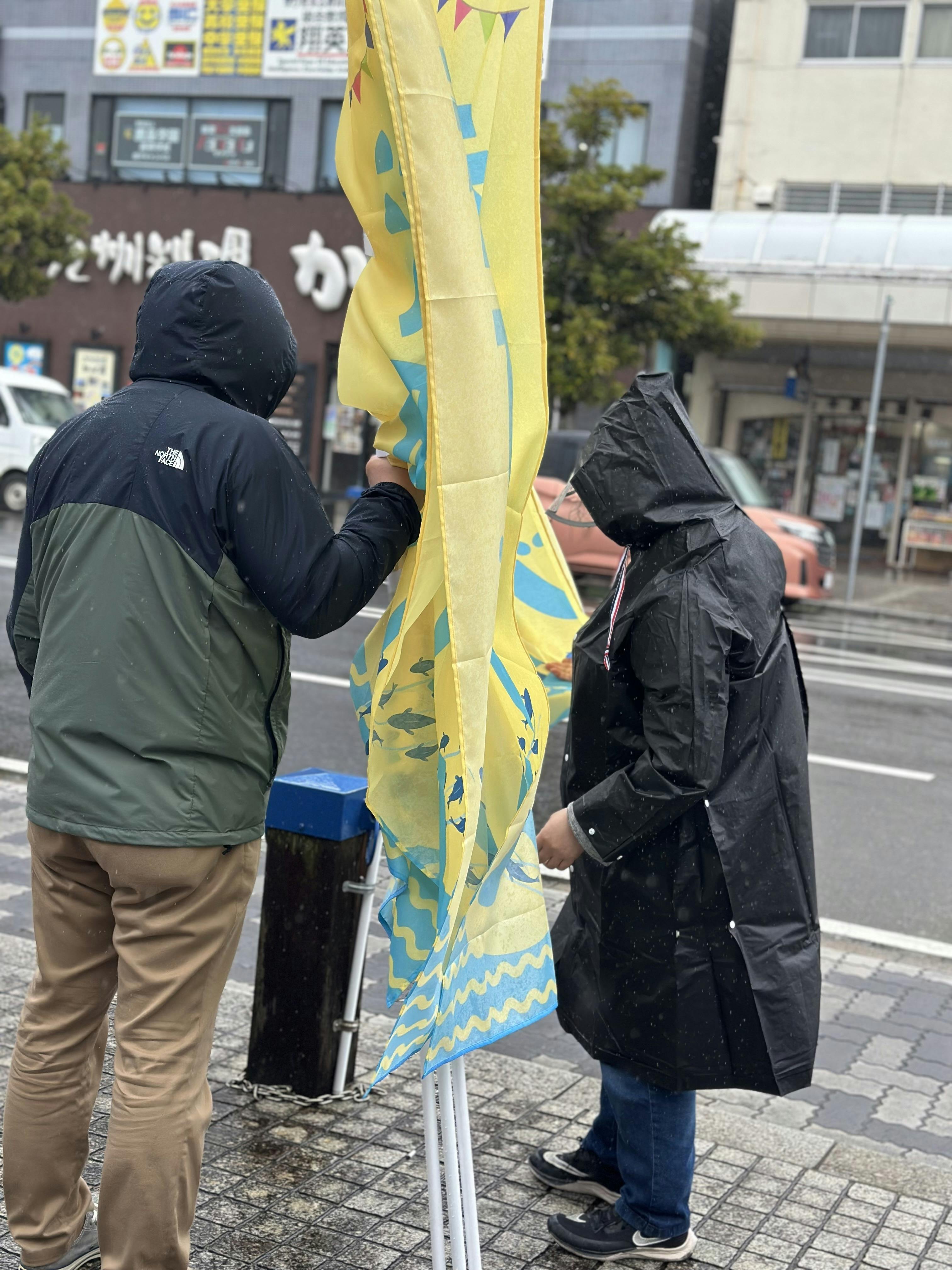 代表、副代表ゆきさん達と雨、風の中、のぼりを立ててきました。