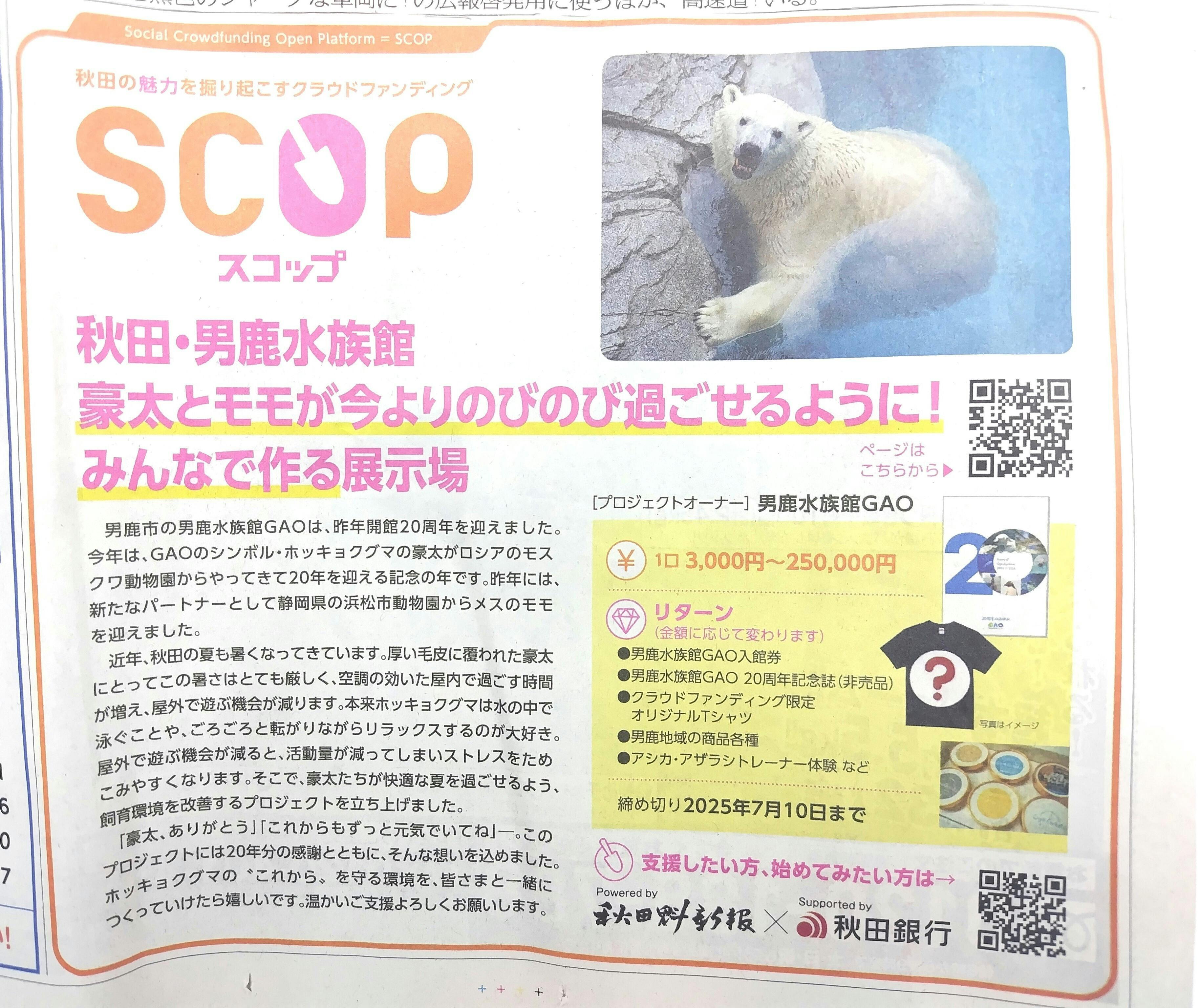【秋田魁新報に広告が掲載されました!】ホッキョクグマ豪太来館20周年プロジェクトへのご支援誠にありがとうございます。4/28付 秋田魁新報に今回のプロジェクトに関する広告が掲載されました!今回のプロジェクトは、秋田魁新報さん、秋田銀行さん、CAMPFIREさんが共同運営しているSCOPを活用しています。いつもたくさんのサポート、本当にありがとうございます。プロジェクトはついに3rdステップの目標900万円に挑戦中です。引き続きご支援の程、何卒よろしくお願いいたします!
