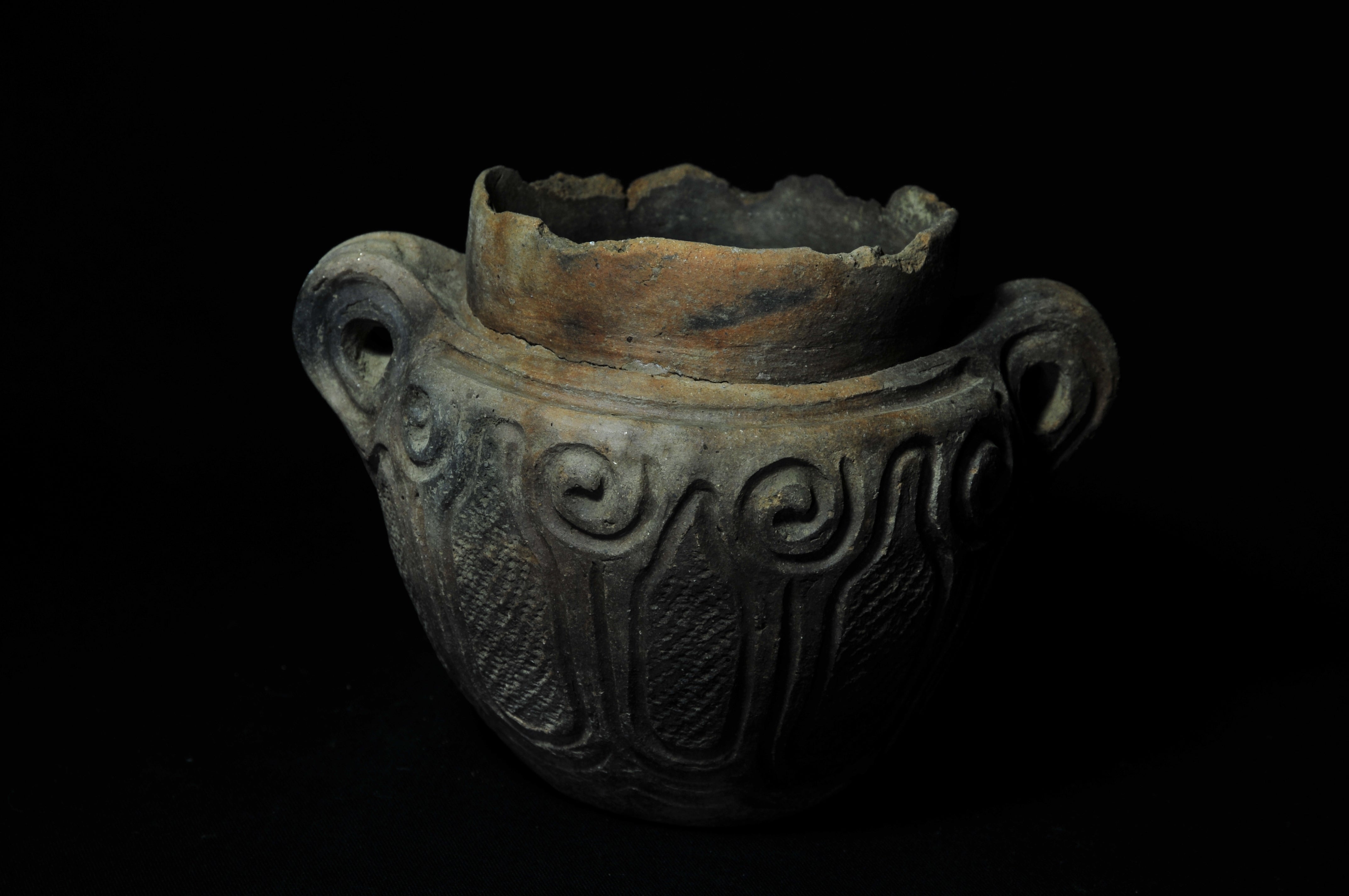 襟付きで力強い沈潜模様の有る土器、エゴマ等貴重な種子の保存用か