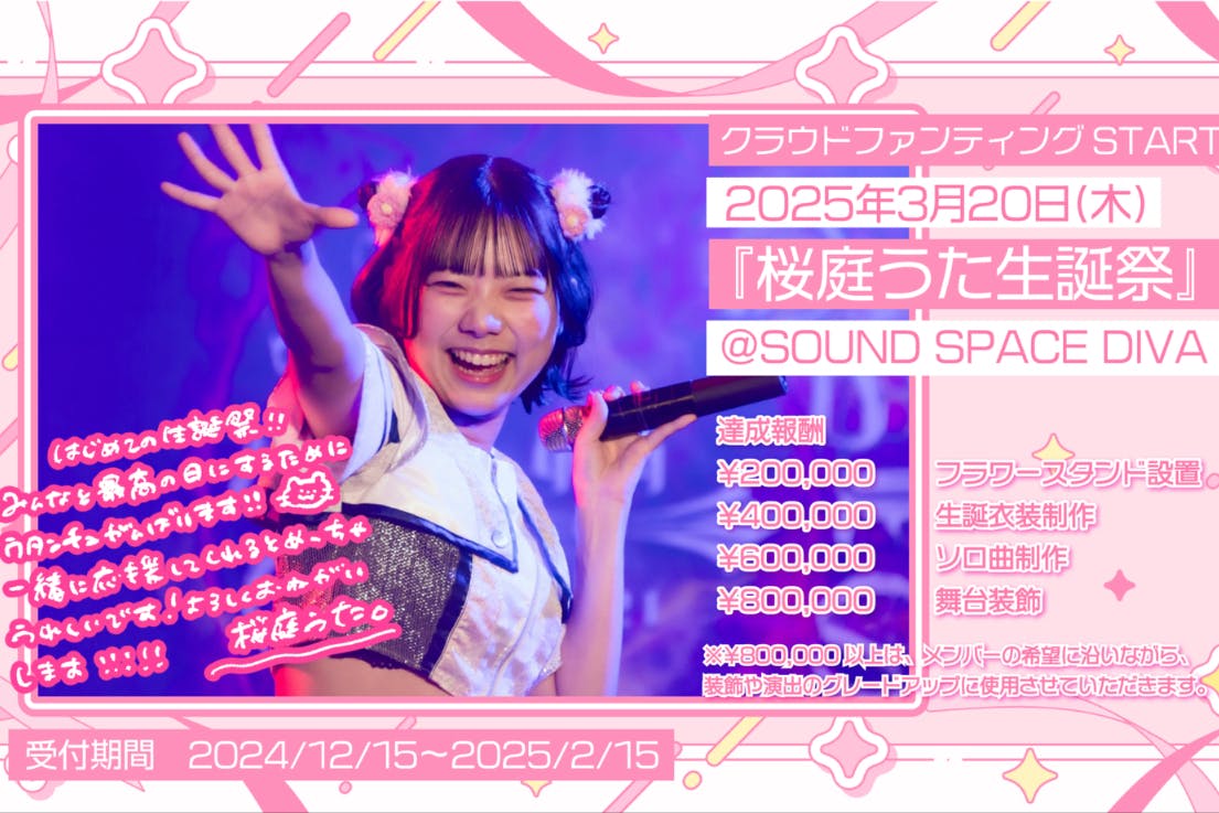 2025年3月20日に名古屋SOUND SPACE DIVAで開催されるアイドル「桜庭うた」の生誕祭です。今回は、彼女の生誕祭を成功させるために、彼女を応援する全てのファンの力を集結させたいと考えています。