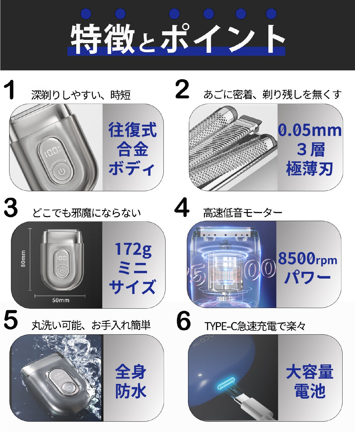 そこで登場するのが、「超小型電動合金シェーバー」。超軽量・コンパクトな設計で、どこでも手軽に使えるのが特徴です。実用性とデザイン性を兼ね備えた逸品で、忙しい会社員の方々に最適なアイテムです。