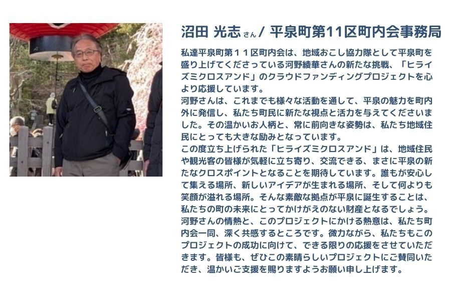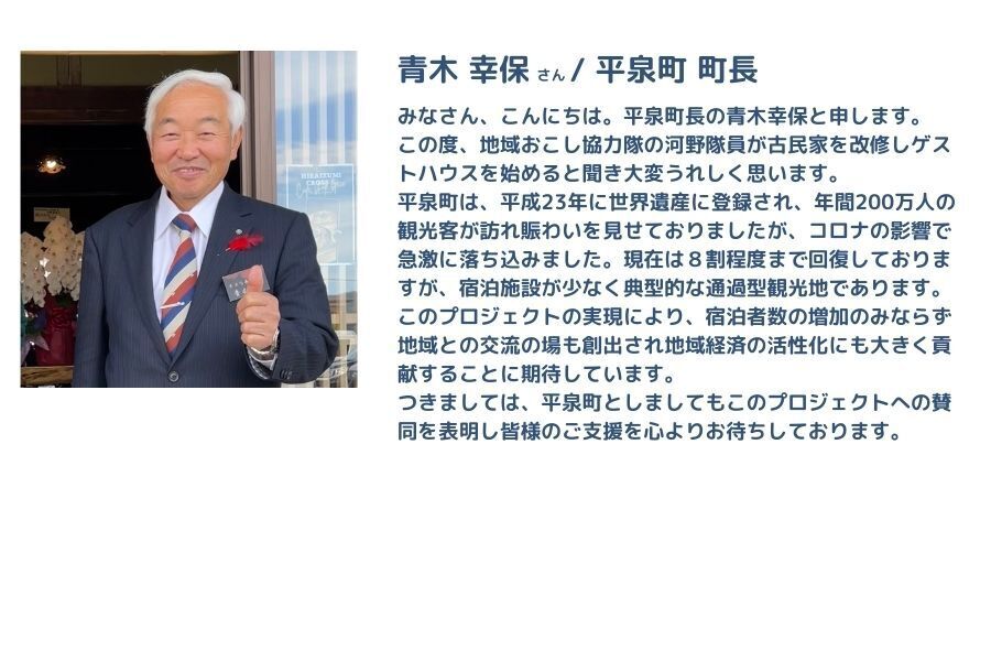 世界遺産のある町でありながら、観光客の姿が少なく、その魅力が十分に発信されていないと感じました。平泉は、単なる歴史遺産ではなく、町全体が「平和思想」のもとに成り立っている特別な場所です。この町の魅力をもっと多くの人に知ってもらいたい、そして地域と関わるきっかけを作りたいと思い、移住を決意し平泉町の中尊寺通りにゲストハウスをオープンするため、今回このプロジェクトを立ち上げました。