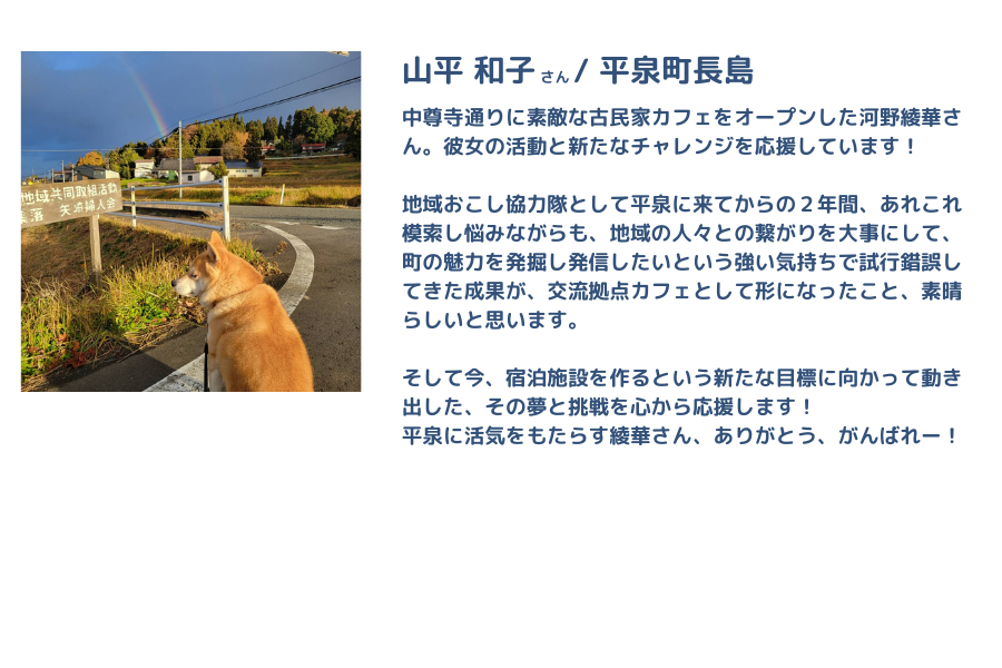 HIRAIZUMI CROSS & (ヒライズミクロスアンド)/平泉町地域おこし協力隊の河野綾華と申します。