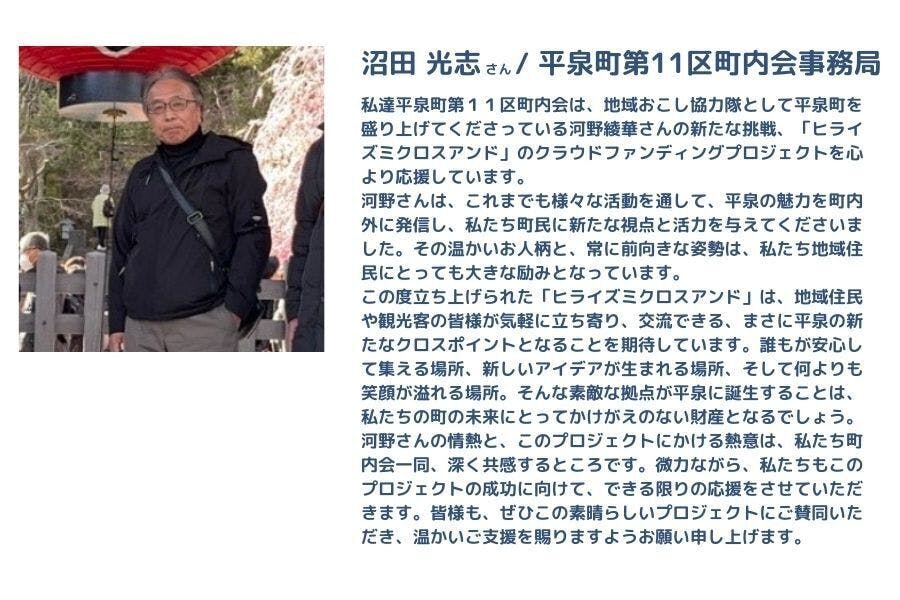 世界遺産のある町でありながら、観光客の姿が少なく、その魅力が十分に発信されていないと感じました。平泉は、単なる歴史遺産ではなく、町全体が「平和思想」のもとに成り立っている特別な場所です。この町の魅力をもっと多くの人に知ってもらいたい、そして地域と関わるきっかけを作りたいと思い、移住を決意し平泉町の中尊寺通りにゲストハウスをオープンするため、今回このプロジェクトを立ち上げました。