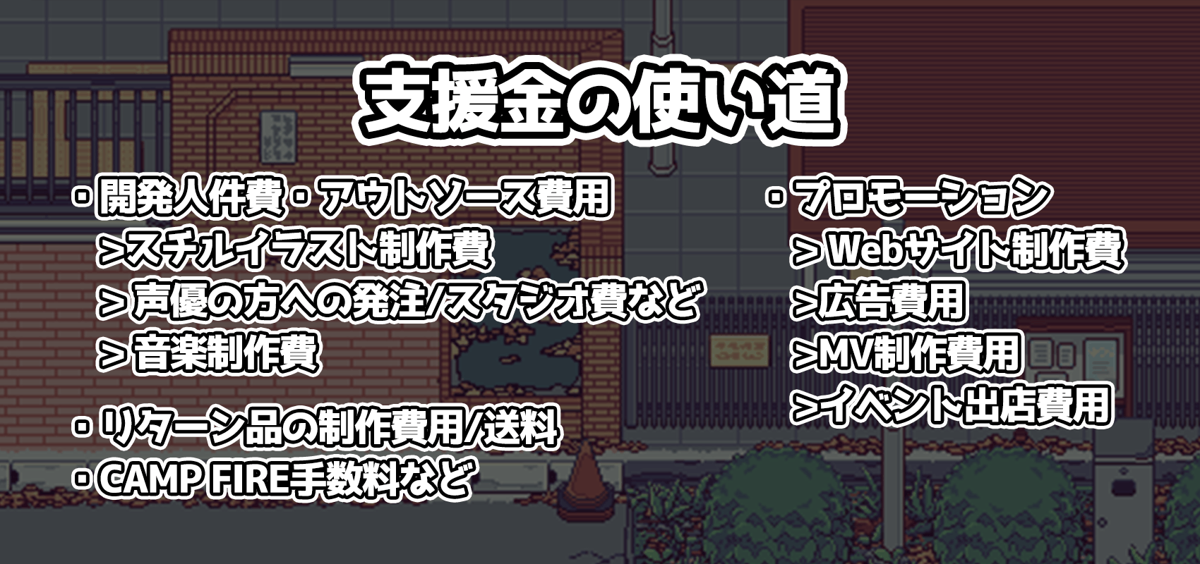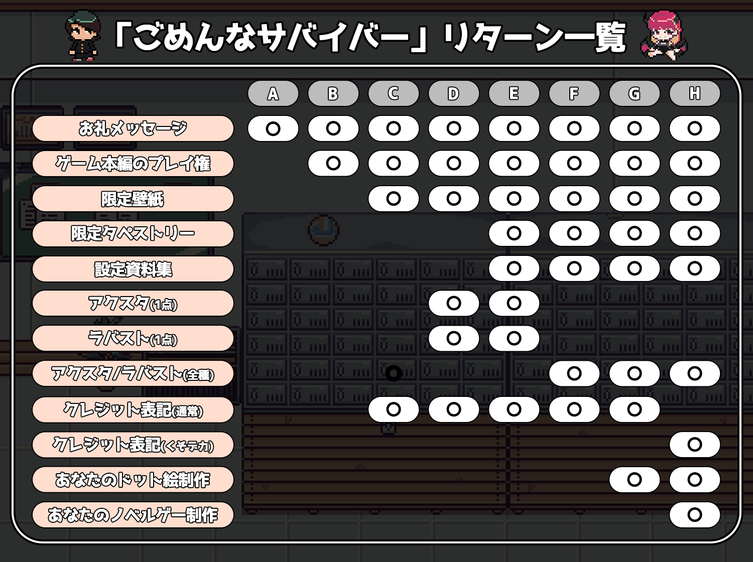 2025/05/19 07:12皆様の温かい応援のおかげで、先日ついに『ごめんなサバイバー』を無事リリースすることができました!心より感謝申し上げます。現在はバグ修正やゲームバランスの調整に鋭意取り組んでおりますため、開発チーム一同、大変慌ただしい日々を過ごしておりますが、落ち着き次第、クラウドファンディングのリターン品の準備を開始いたしますので、もう少々お待ちいただけますと幸いです。これからもより良いゲーム体験をお届けできるよう、全力で対応を進めてまいりますので、是非『ごめんなサバイバー』をお楽しみください!制作チーム一同、皆様のご支援に深く深く感謝しております。今後とも何卒よろしくお願い致します。 もっと見る