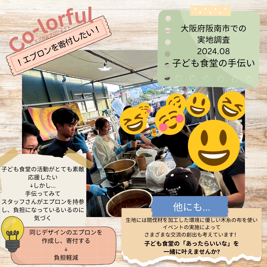 需要分析として実際に子ども食堂に訪れ、スタッフの方々、運営に携わる阪南市社会福祉協議会の方々とお話しした際、スタッフの方から「共通のエプロンがあると、持参しなくて済むし、ユニフォームのような一体感が出て良い」という声が実際にあがり、このプロジェクトには需要があることを確認😯❗
