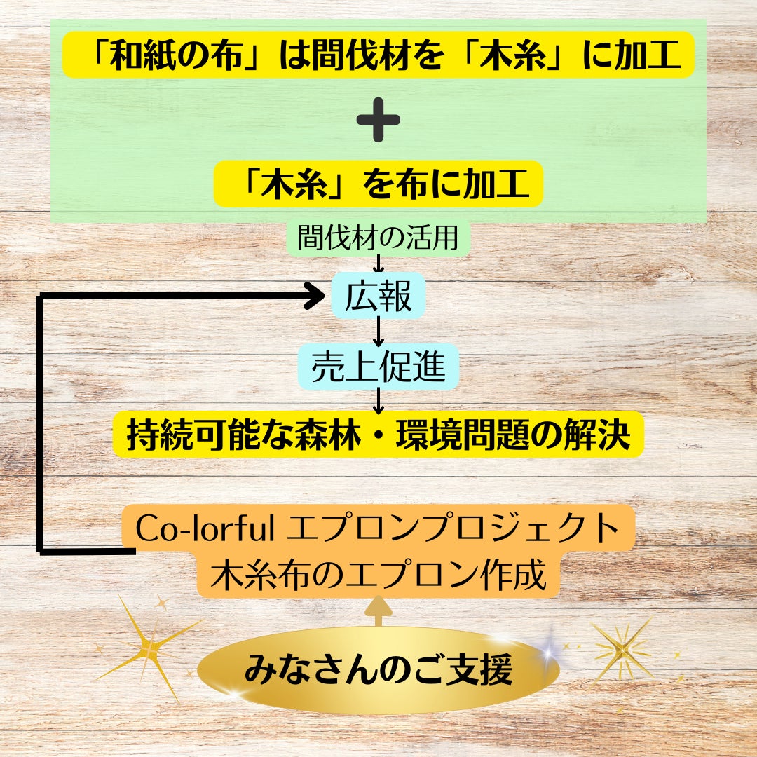 今回、「和紙の布」さんの木糸を織って作られた布をエプロンの生地に使うことで、この問題の周知と、解決策となる「和紙の布」の商品や取り組みを広めていくことを実現したいです。