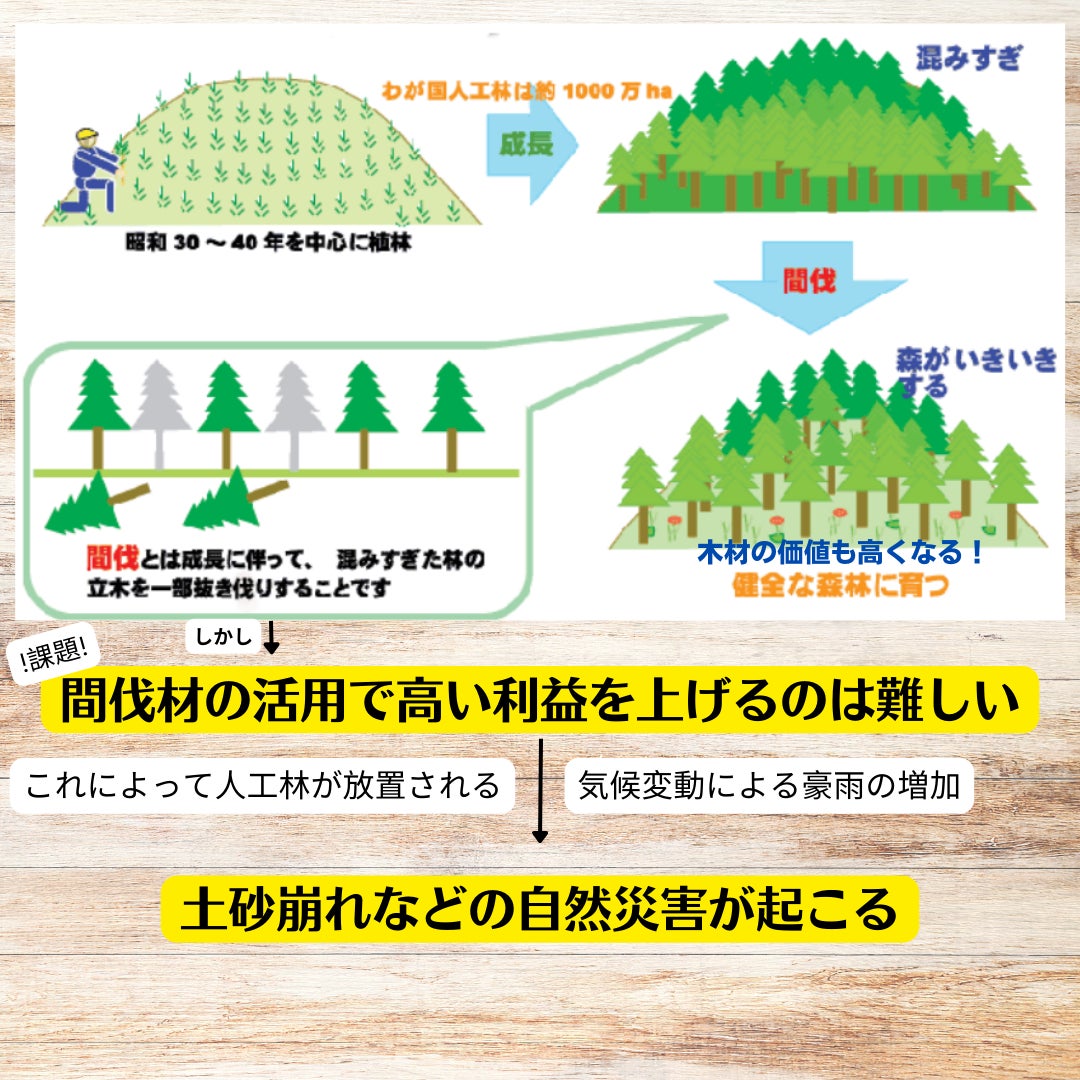 しかし、丸太を伐採しても利益が少なく、間伐をされないまま放置される森林は増加しています。林業従事者も間伐材をはじめ、いろいろな段階で出る木材のさらなる利益化を課題として掲げています。