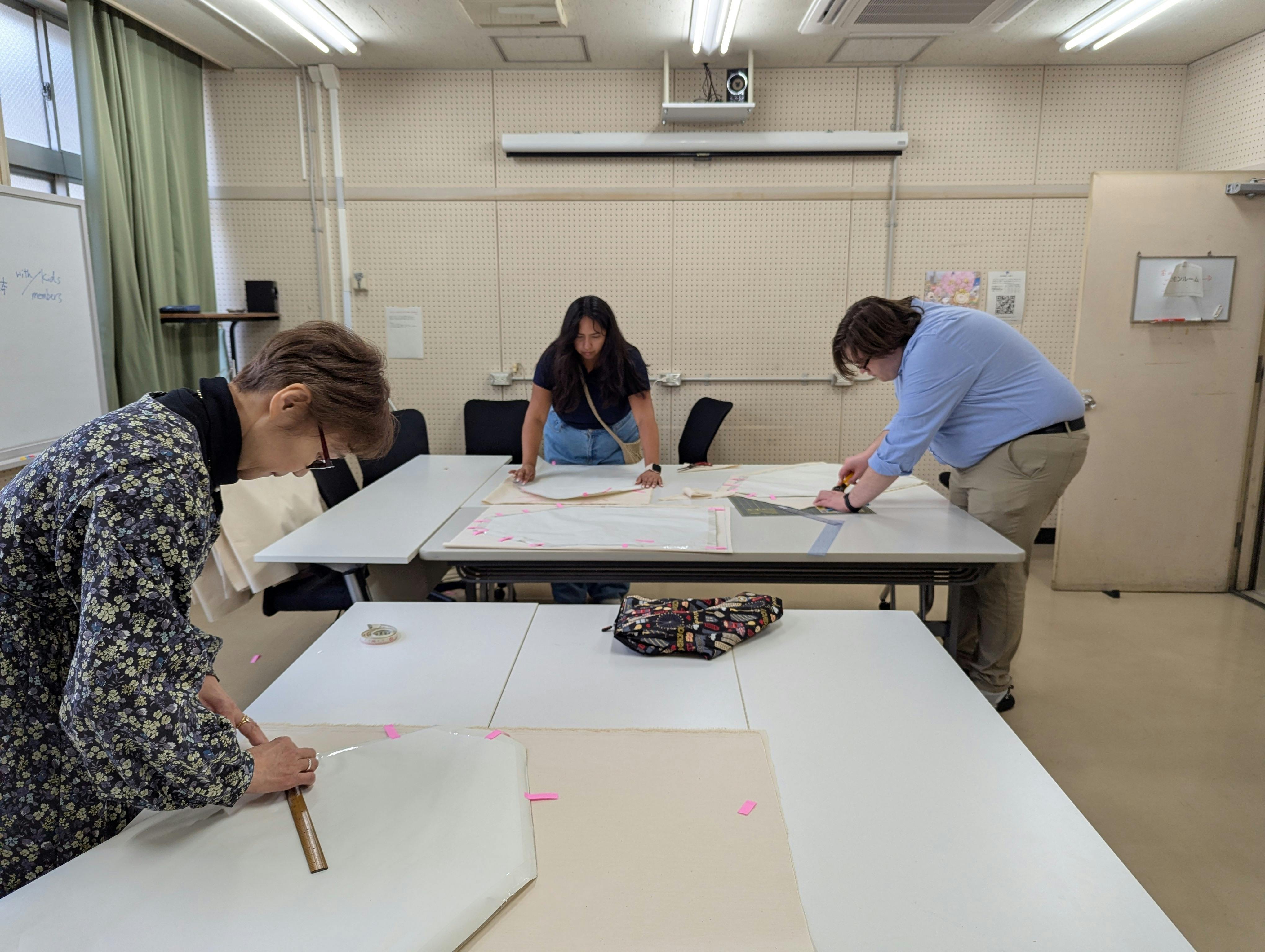 来日前から、遠隔授業を通してプロジェクトの内容を共有し準備を進めてきましたが、初顔合わせでは、言葉の壁を越えてこのプロジェクトに込める思いやデザインについて熱心に意見を交わしました。エプロン制作のイベントの成功に向けて、細部にわたり丁寧に検討を進めました。子どもたちの喜ぶ顔を想像しながら、一つ一つの作業に真剣に取り組みました!
