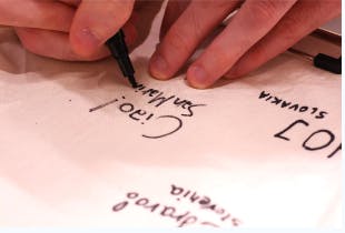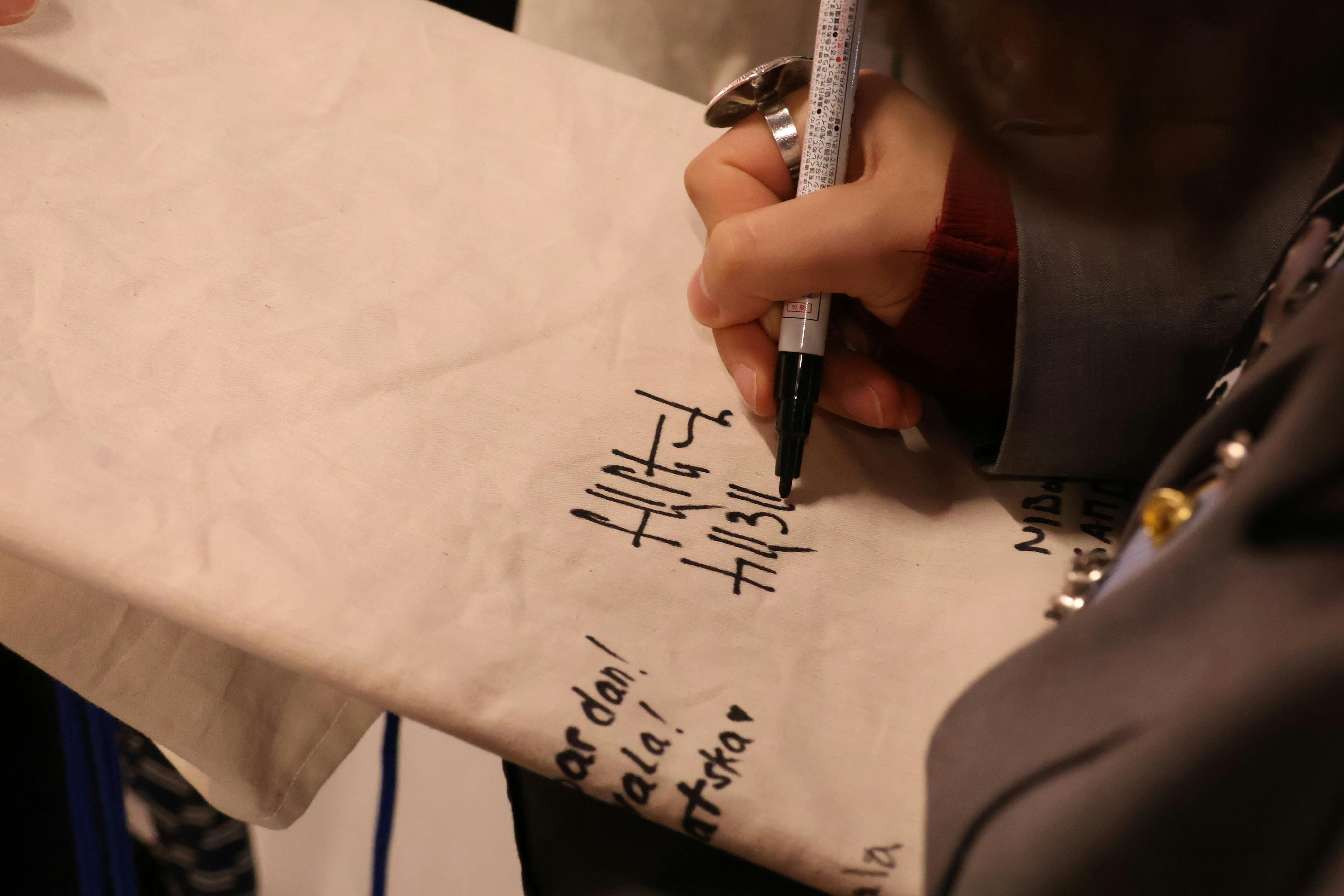 また、その日にはコモンズ館を回り、出展している各国担当者の皆様にこのプロジェクトについて説明をし、エプロンにそれぞれの言語で「こんにちは!」とあいさつを書いていただきました!