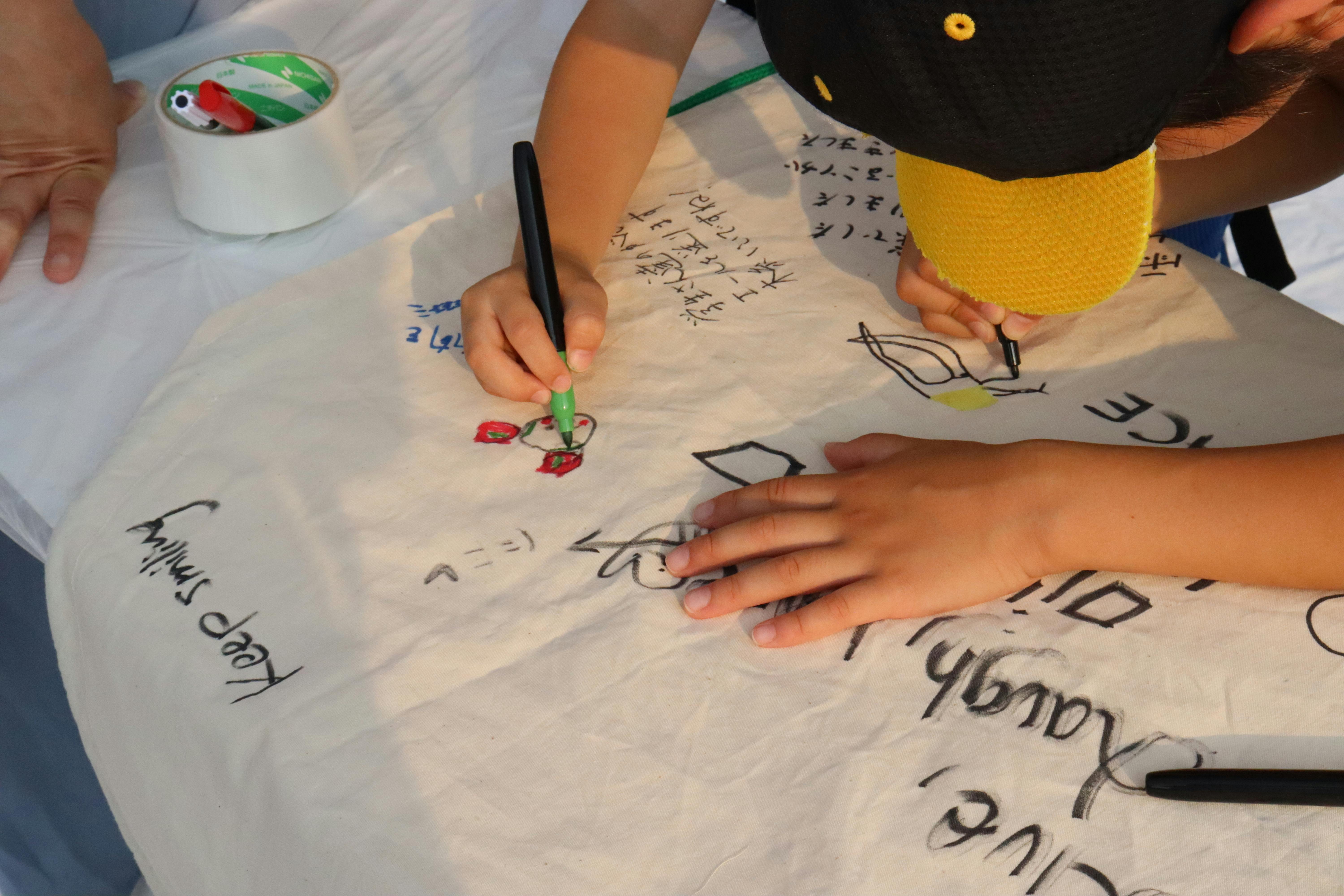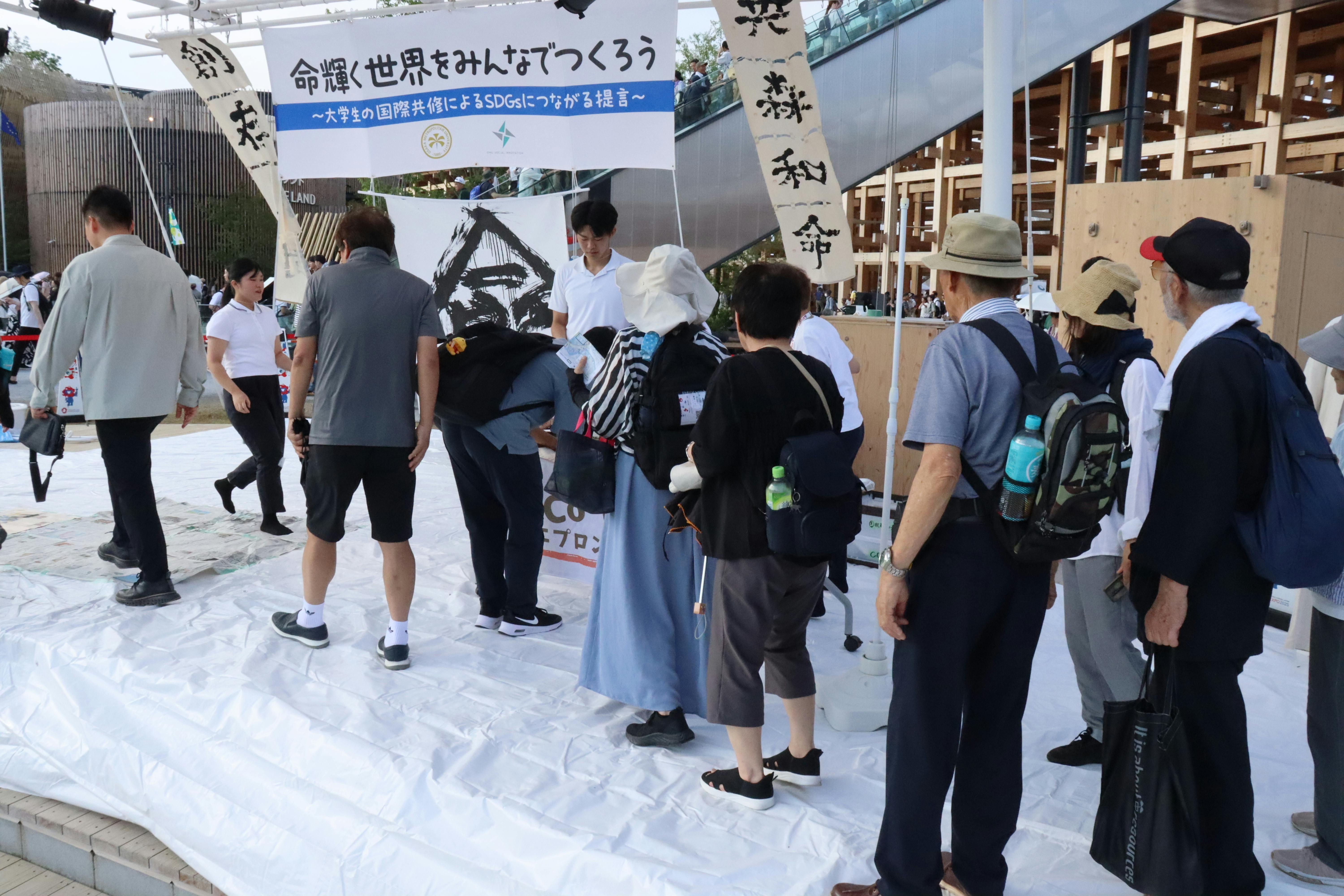 続く6月27日には、抜けるような青空の下、さらに多くの来場者で賑わう中で発表を行いました。この日は、エプロン製作の進捗状況や、先日開催した子ども食堂でのエプロン制作イベントでの子どもたちの笑顔の様子など、より具体的な活動成果を交えながら、私たちの取り組みを世界に向けて発信しました。両日とも、発表後には来場者の皆様に完成したエプロンに思い思いの寄せ書きをしていただく交流の時間を作りました。「寄せ書きエプロン」もまた子ども食堂に寄贈されます。多くの来場者の皆様から温かい応援の言葉や質問をたくさんいただき、改めてこのプロジェクトが持つ可能性と、皆様からの期待の大きさを実感しました。