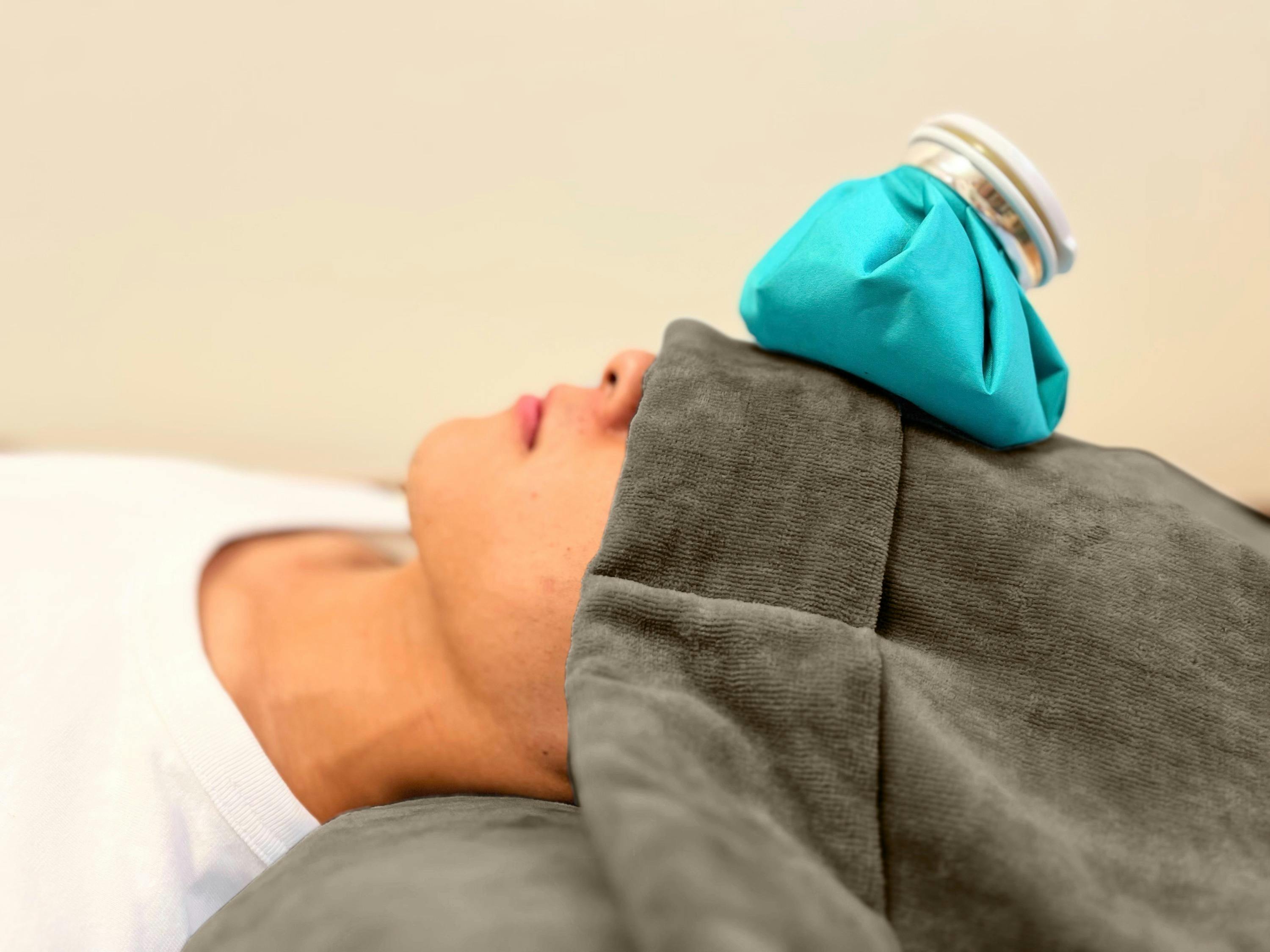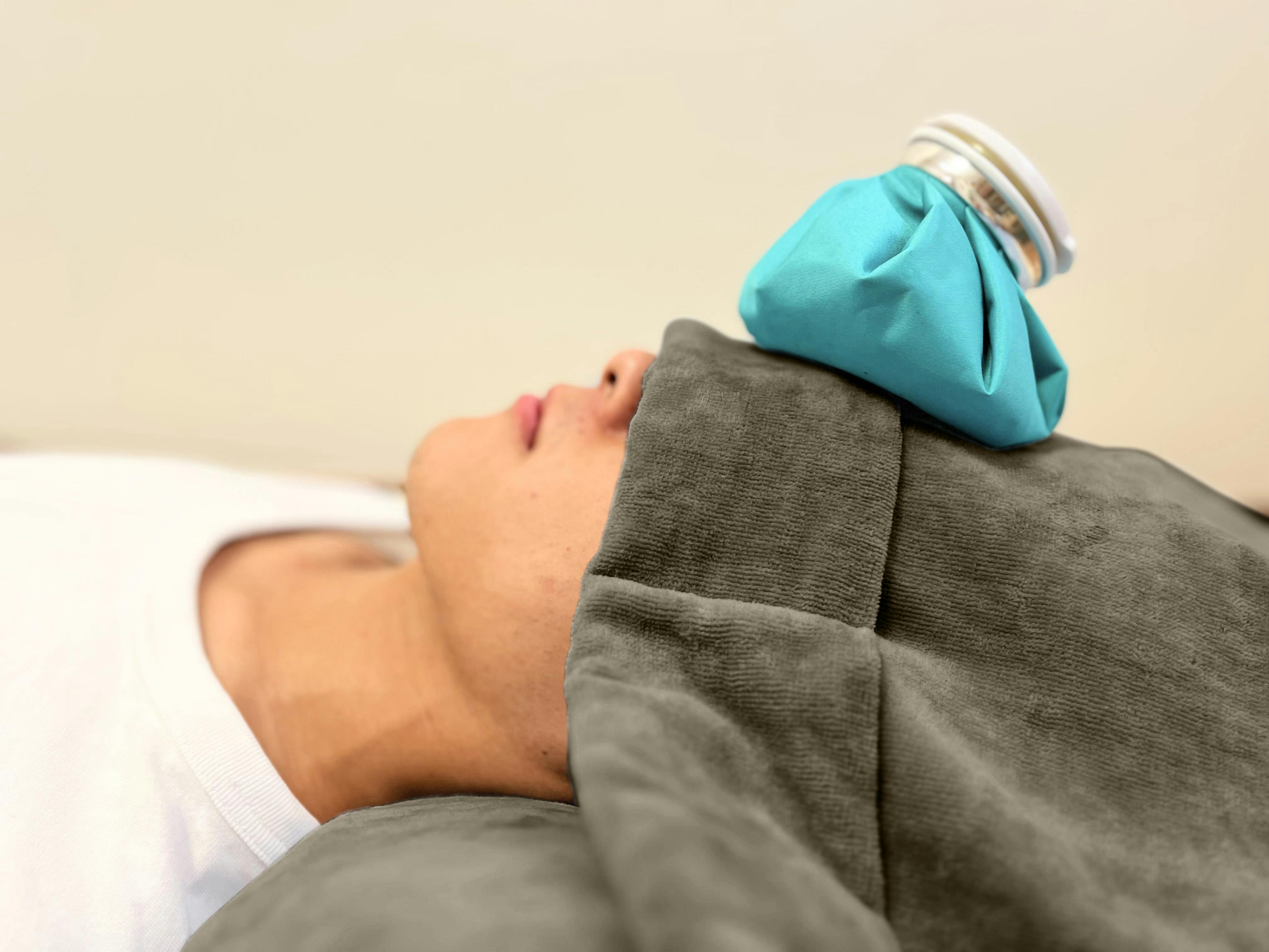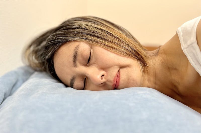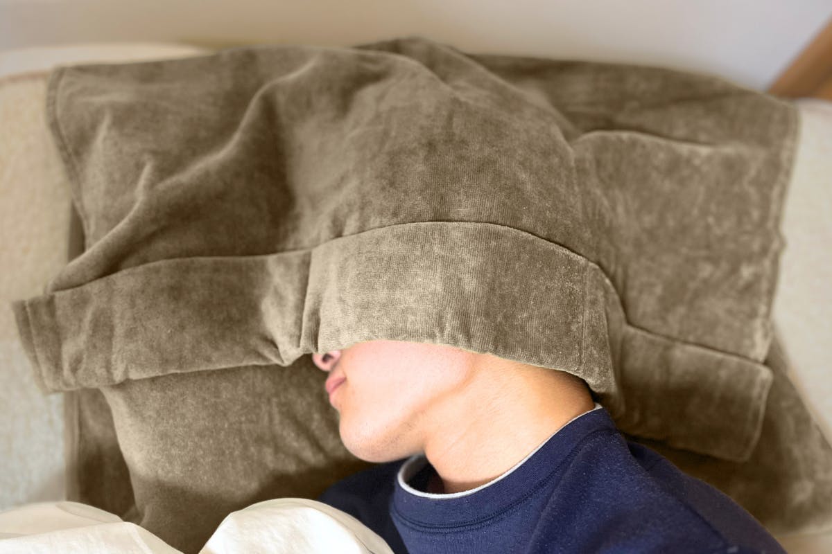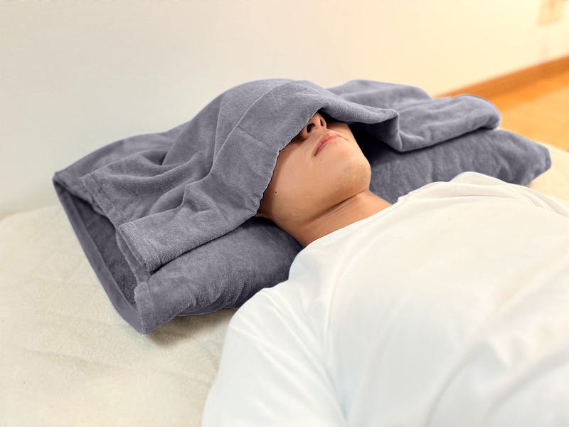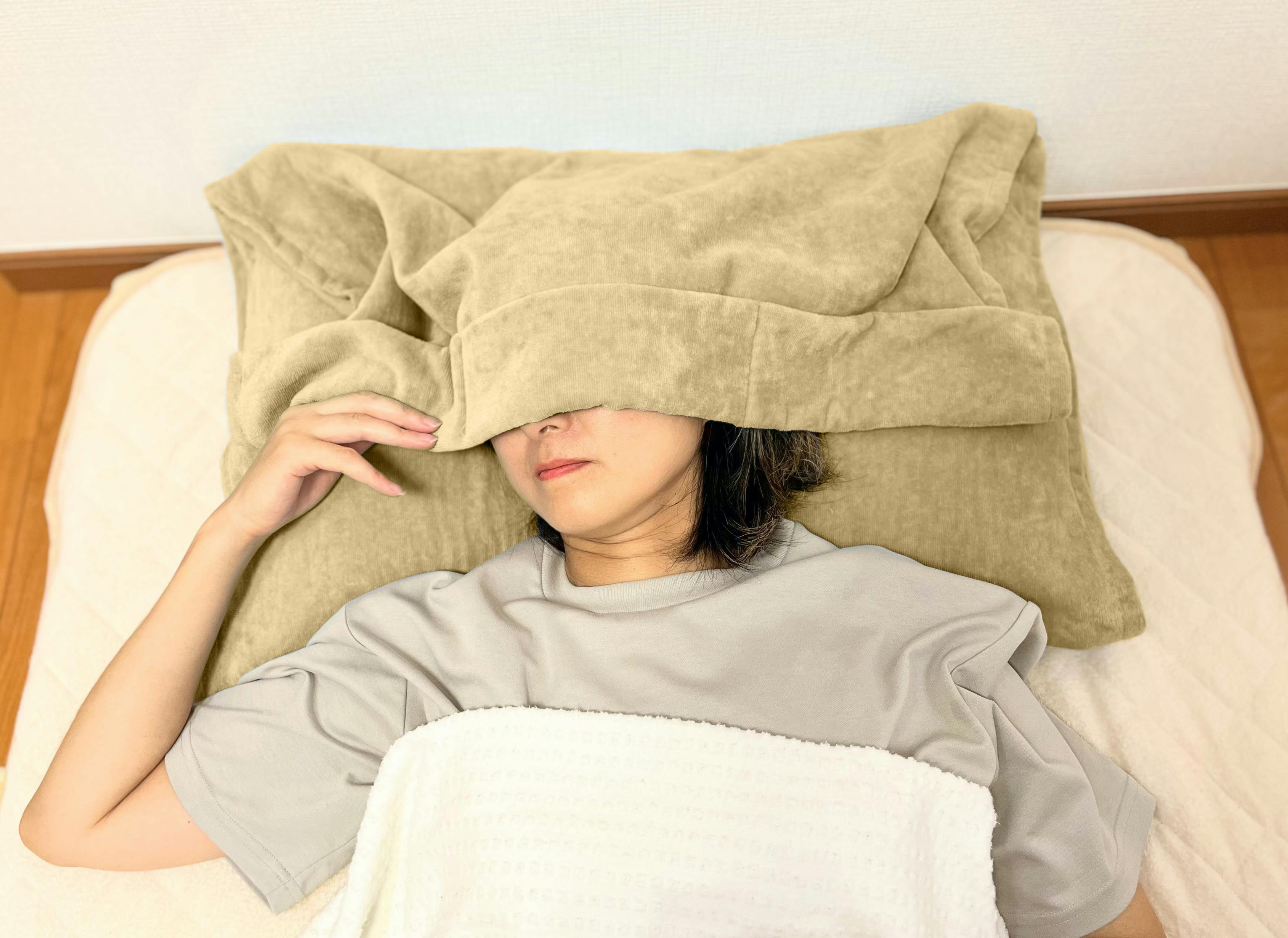 アイマスクは、”装着”しますが、本製品では、片手を上げて、被せるだけになります。頭を覆うことで包まれる感覚が心地よいです。厚みのある生地を重ねており、程よく沈み、光を遮ります。