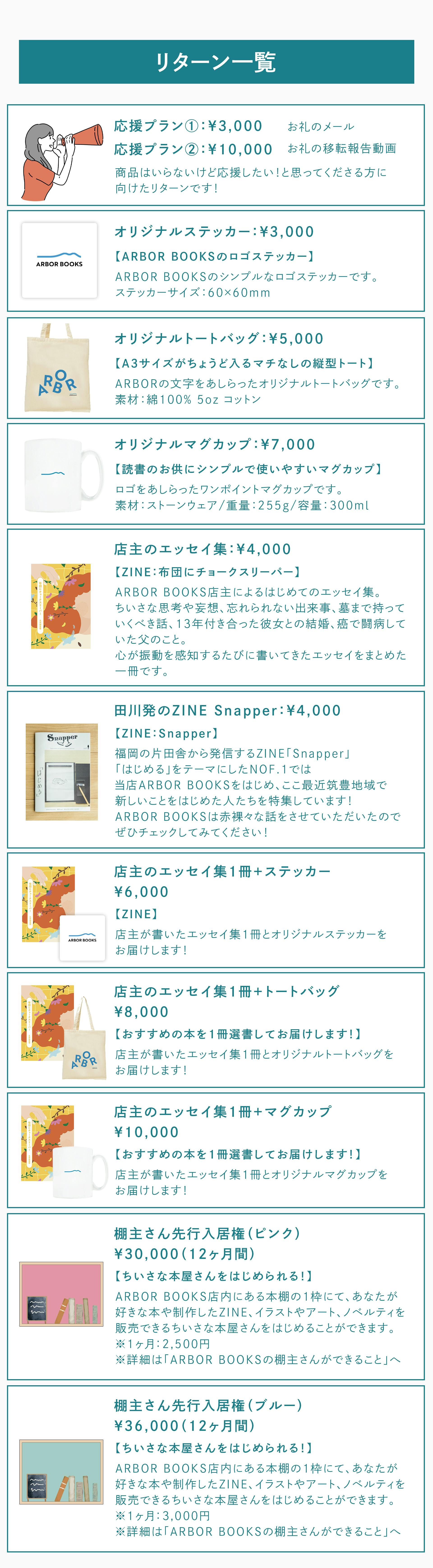 2025/05/24 21:13クラウドファンディングも残り7日!ついにラストスパート目前です!達成率に関わらず、ARBOR BOOKSは始まりますが、せっかくならドーンと勢いもつけたいので、引き続き本チャレンジを拡散していただけると嬉しいです!https://camp-fire.jp/projects/824404/view-今回はシェア型本棚について利用規約を制定したので、少しその経緯などのご説明をします。当店には「香春町に本屋をつくるワークショップ」にて、地元の木材を使い、RELAYS HOME CENTERさんにご指導いただきながら、たくさんの人の手を借りて製作した大きな本棚があります。その本棚はARBOR BOOKSが本を売るために使う場所ではなく、本を通じた活動がしたい方が使用できる「シェア型本棚」として活用していきます。そうした場を設けた経緯が大きく二つあります。一つは「本屋と町の共存関係」についてです。町から本屋が消えているということは多くの人が知っている事実です。では、これからは人口が多い場所、アクセスの良い立地でしか本屋ははじめることも、継続することもできないのでしょうか。確かにARBOR BOOKSのように人口が一万人でかつ半分がご高齢の方が住む香春町に、新しく本屋をはじめるなんてことは、事業として難しいと言わざるを得ないでしょう。しかし、私はやり方次第ではないか、と考えています。そこで当店が考えていることが「本屋と町の共存」です。事実、香春町の方々は町に本屋が要らないと思っているわけではなく、本屋ができることを喜んでおり、応援してくださっています。だからこそ、「香春町に本屋をつくるワークショップ」などの運営も手伝っていただき、共に本屋をつくるということに取り組んでいただいている現状です。町役場の方や空き家相談室を運営している「香春町視点」を持つ方々からお話を聞くと、純粋に香春町に本屋ができることにメリットがあるとのこと。だからこそ、まるで自分ごとのように活動を応援をしてくださっています。ここに私は「地方で本屋をはじめ、継続していくための活路がある」と考えました。では、本屋という視点でこの共存関係をより強固なものにするため何ができるか?そこで考えついたことが「シェア型本棚」です。ARBOR BOOK視点でシェア型本棚を運営するいちばんの目的は「香春町の関係人口の増加」にあります。香春町にある当店の棚を借り、居場所を持ち、ちいさな本屋をはじめること。今まで香春町という名前すら知らなかった方々でも、棚主になることで香春町が一つの活動の場所になり、町のことを知っていくことになる。これが「本屋からはじまる町づくり」の一端になるのではないかと思っております。そして、ARBOR BOOKSには田川でイベントを起こす方や自分でお店を運営している方、空き家の管理運営を行い移住相談を受けている移住者の方など、多岐に渡る方々がいます。「シェア型本棚」の棚主をやってみて「自分でお店をしたい」と思った場合、実際に空き家の見学へ行くことも、空き家を改装してお店をしている方にお話を伺うことも、自分でお店を始めた方の経験を聞くこともできます。これは勝手に考えていることですが、そんな一連の流れでまだ眠る空き家を本屋にしたりカフェにしたり、自分の考える理想の居場所を作ったりする方が増えたらいいな…と思っています。私ができたように、香春町には具体的にそれを実行する手段の多くが揃っています。二つ目は「本に携わる何かをしたかった過去の自分に向けた場所」をつくりたかったからです。本屋をはじめる前の私は「いつか本屋をやりたい、もしくは本に関わる何かをしたい」と悶々としていました。本当にご縁に恵まれて結果として本屋をはじめることができましたが、はっきり言って運が良かっただけです。だからこそ、私と同じような思いを抱えた人たちが「スモールステップから本に関わる」こと、そして「本屋をはじめたいときに話を聞ける場所」をつくりたいと思いました。現在行っている「喋る本屋」というPodcastも、本屋のやり方を説明してくれる本は読んだけど「本屋のプライベートってどんな感じなんだろう?」と当時思っていた自分に向けた一つの回答として行っているものになります。ですので、当店のシェア型本棚の棚主になった方々には限定で「本屋をやっている方」を招いたオンライントークだったり、棚主の方々と一緒に本のイベントを企画・実行したりと「いつか本屋をやりたい、もしくは本に関わる何かをしたい」と悶々としていた自分が「やってほしかったサービス」を提供する予定です。もちろん、どんな思いを持って参加いただいても大丈夫ですので、本を通じて日々が豊かになるよう、一緒に活動できたらと思います。以上の二つの経緯から、当店のシェア型本棚ははじまり、この思いをRELAYS HOME CENTERさんに伝え、0からシェア型本棚をデザインしてくださいました。私にとって間違いなく宝物であるこの本棚に、皆さんの思い思いの本が並