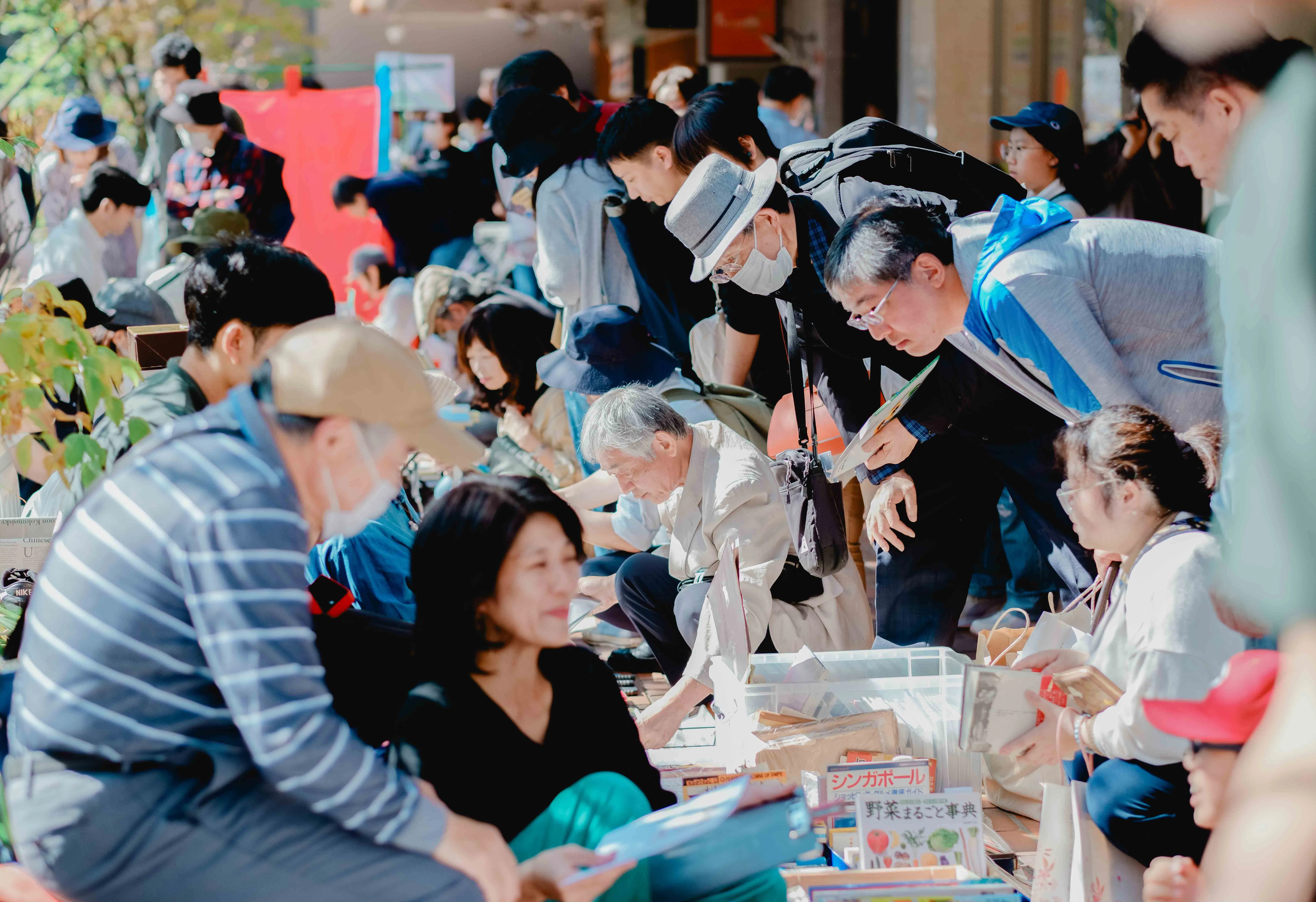 福岡市中央区にあるけやき通りのお店の軒先に公募によって集った出店者の方々が思い思いの古本を並べ、小さな古本店が軒を連ねます。
