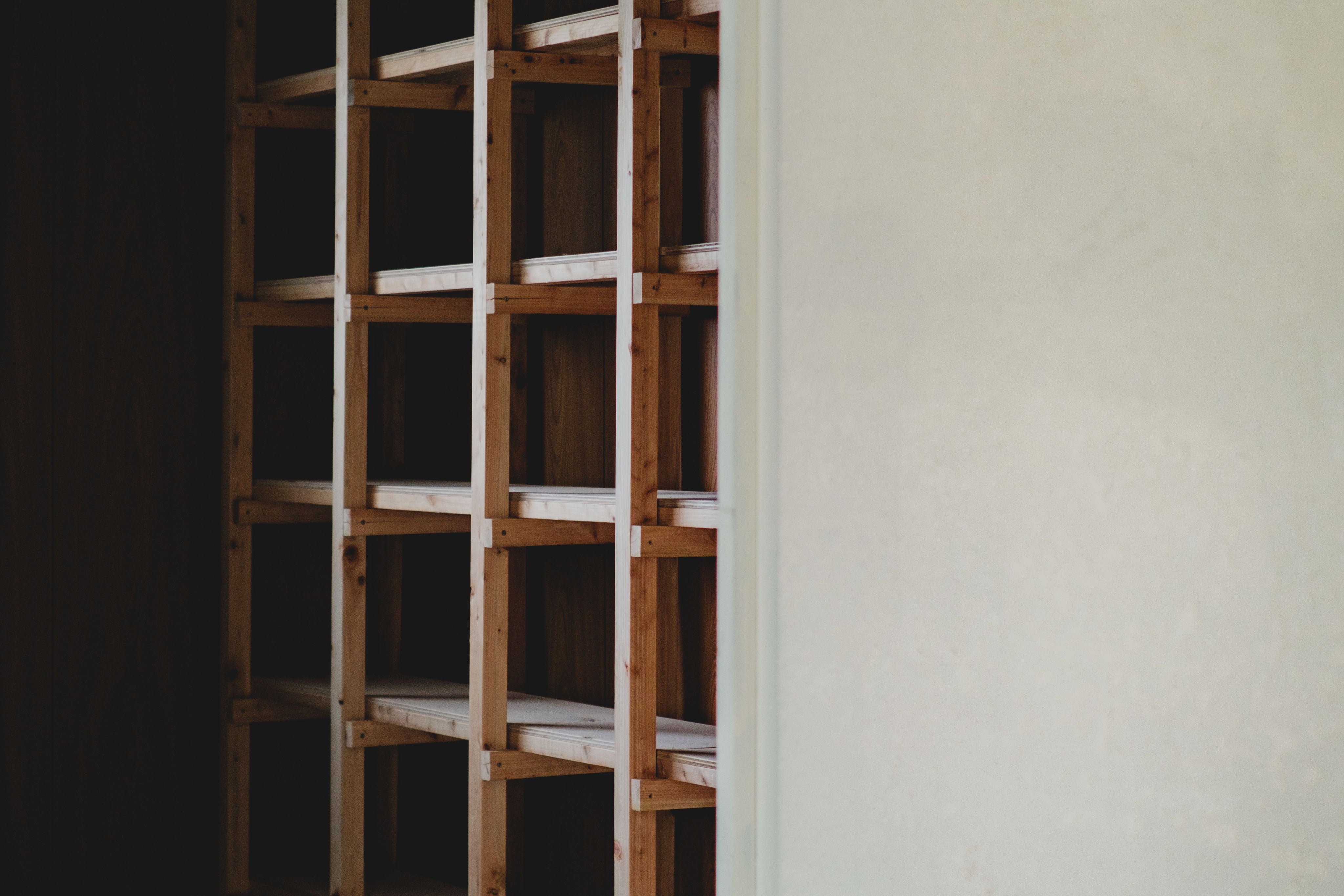 となり同士の仕切りを外した風通しの良い本棚に