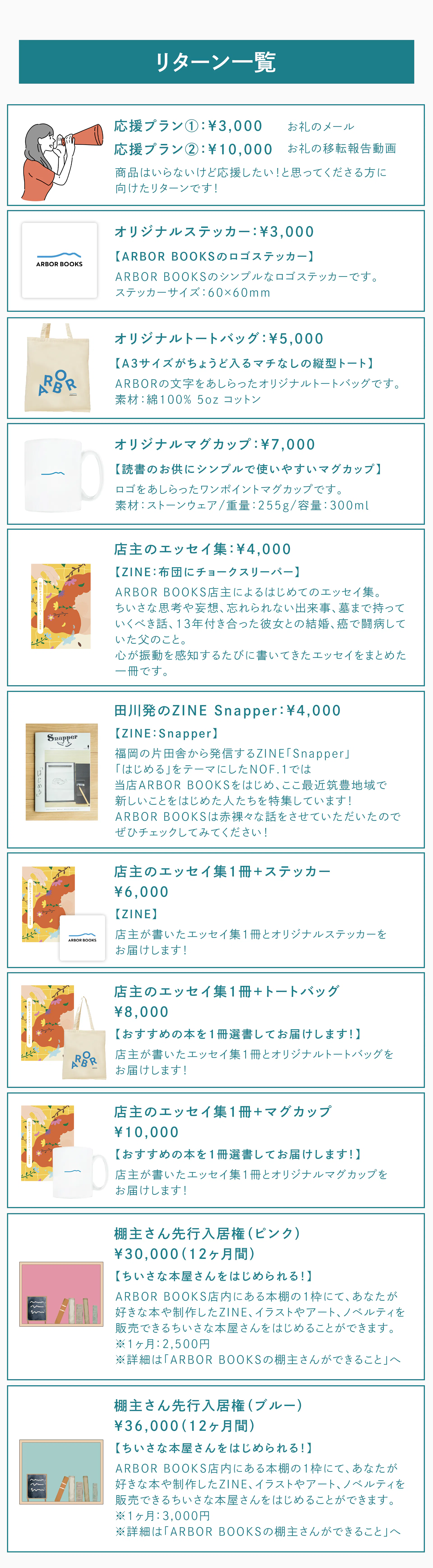 その名前を体現していくためにも、棚主さんたちが入っていただくことは必然だと思い、このようなリターンをご用意いたしました。