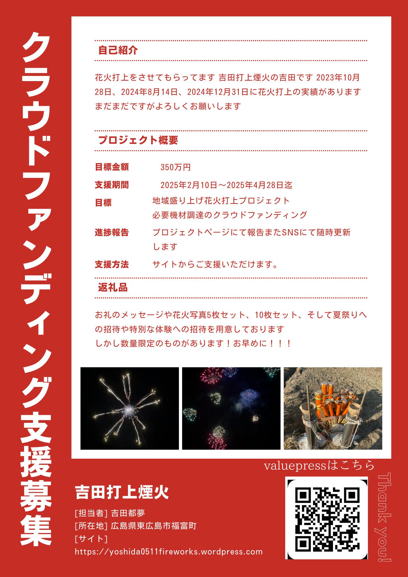 花火玉ご支援プランや機材導入応援プランにも付いてきます!花火玉ご支援プラン、導入応援プランの方には初回開催日から約1年間、打上現場の招待をしようと考えております。その時も人数制限はありますが...