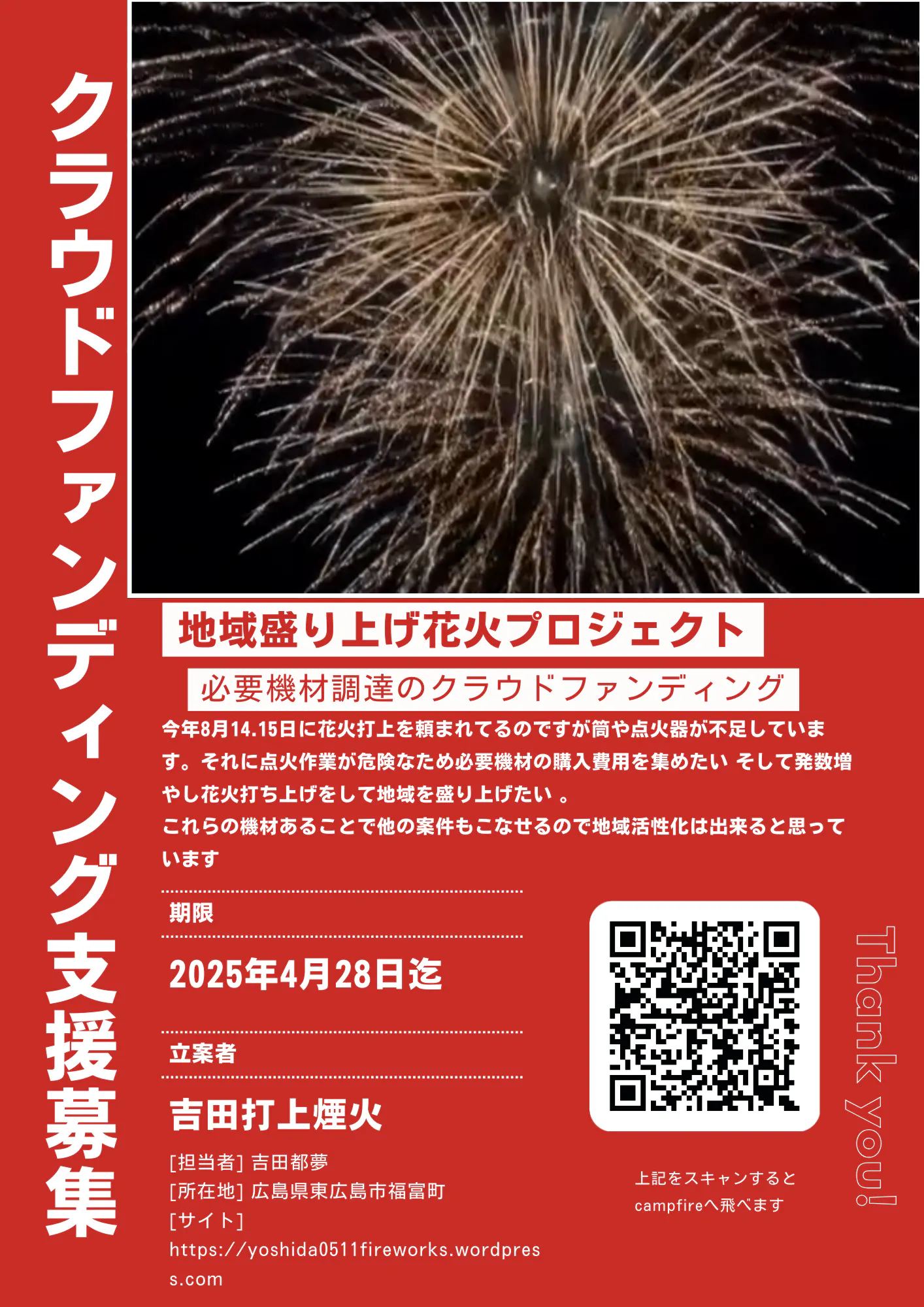 2025/03/06 04:30皆様こんばんは吉田打上煙火の吉田です拡散等してもらう為友人等に協力してもらってるのですがなかなか支援していただけてない状況ですこちらプロジェクトの魅力はやはり花火打上現場の体験の招待です!花火玉ご支援プランや機材導入応援プランにも付いてきます!花火玉ご支援プラン、導入応援プランの方には初回開催日から約1年間、打上現場の招待をしようと考えております。その時も人数制限はありますが...ですがその特別体験ができるのはとても魅力的だと思いませんか!具体的には花火打上現場(点火現場)から花火打上る様子を見ていただけます。そして少し早めに来られた方は花火玉をお見せ致します!そして、なんと打上時間になると自分達と同じところから花火を見ることができるのです!この場所には人数制限がございますのでご了承ください。普段は遠くから見る花火ですがこちらご支援していただけましたら、近くからご覧になられます!どうか...皆様ご協力の程よろしくお願いしますあっちなみにこのチラシは自分で制作しました下手ですがこちらのチラシはvaluepressのプレリリースの記事、そしてこちらcampfireのページに飛べるQRコードを作成して記載しておりますどうか拡散等していただけたら助かりますよろしくお願いします もっと見る