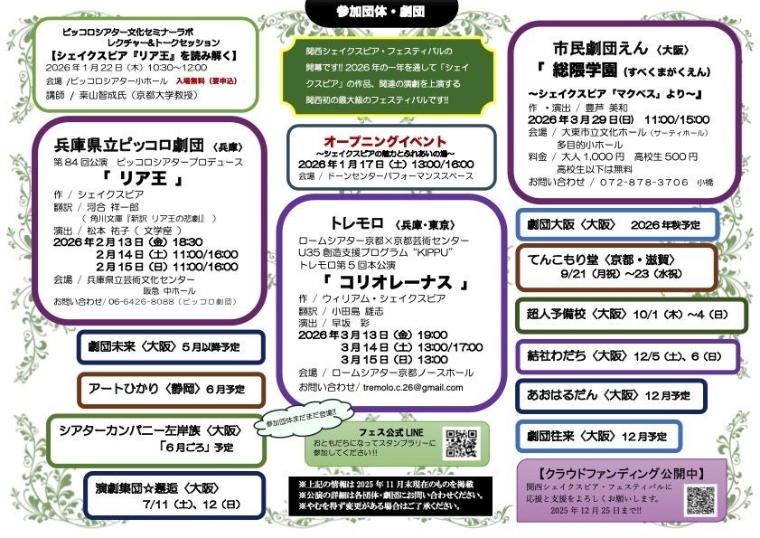 2025/12/05 10:001月からの参加団体・劇団のスケジュールです!!1年かけての最大級の「シェイクスピアフェスティバル」3月までの情報はこのようになっています。色々な「シェイクスピア」作品や関連の演劇が観れます。乞うご期待ください。 もっと見る