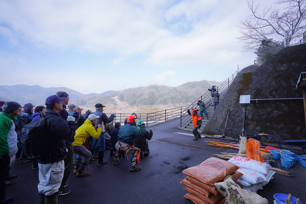 クラウドファンディングが公開される直前の2/23、土師ダムで毎年行われている「桜守プロジェクト」に参加してきました。朝から雪が降る寒い一日となりましたが、100人以上の方が参加され、土師ダム周辺の桜の手入れやゴミ拾いを行い、みんなで土師の春の桜を望む活動となりました。(写真は人と樹の会恒例の安全祈願「どんぐりころころ」の様子)