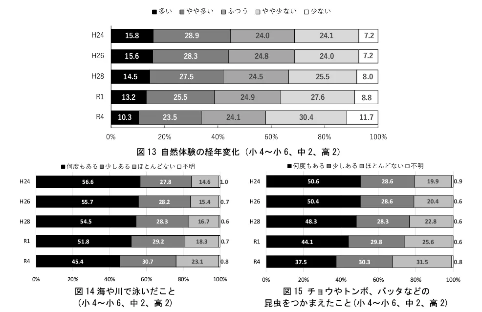 例えば、国立青少年教育振興機構が実施した「青少年の体験活動等に関する意識調査(令和4年度調査)」では、平成17年から令和4年の17年間で、青少年の自然体験や生活体験の機会が減少傾向にあることが報告されています。