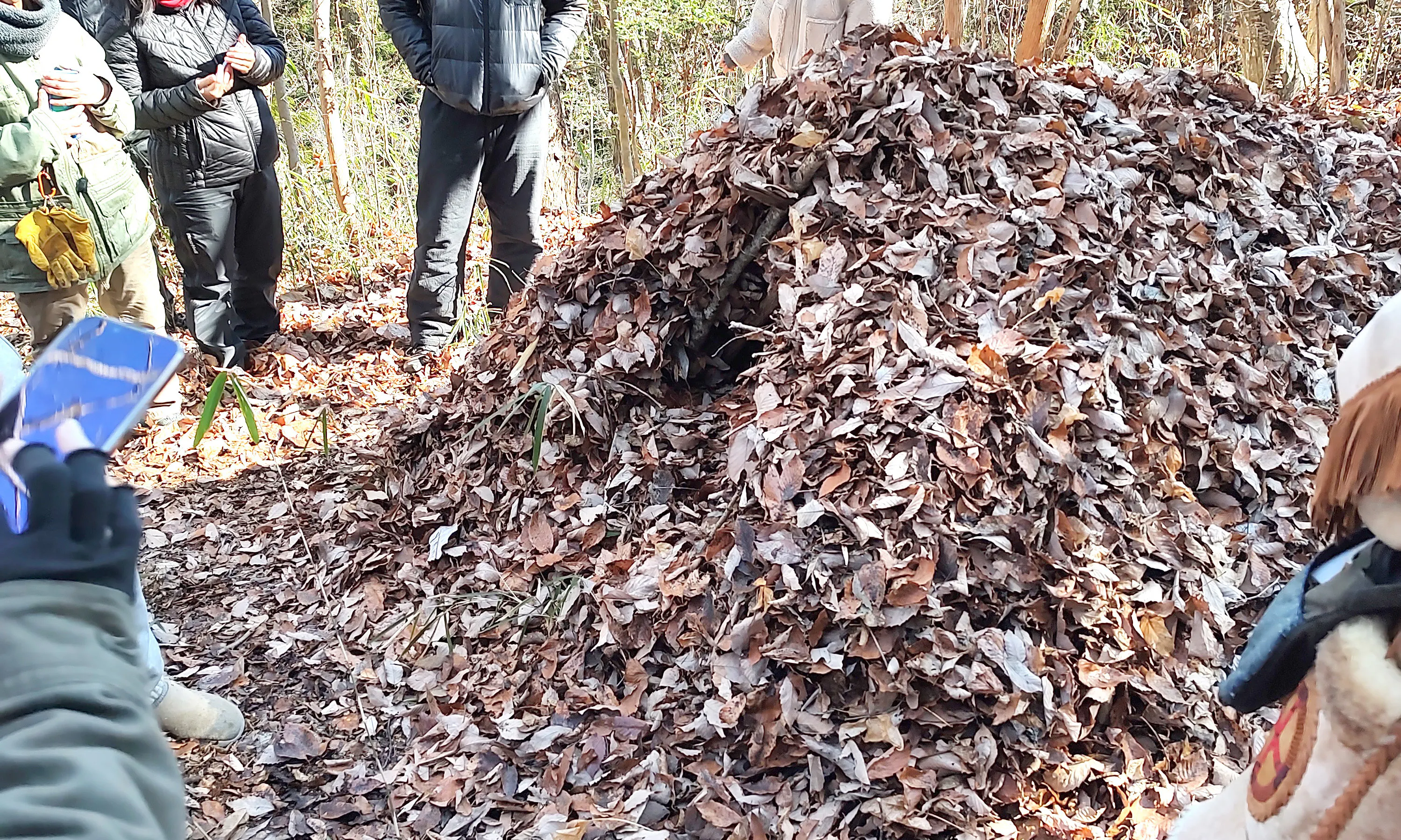・ ブッシュクラフト体験:枝と落ち葉でシェルターを作ったり焚き火の体験から「あるもので考えて目的を達成する」体験。