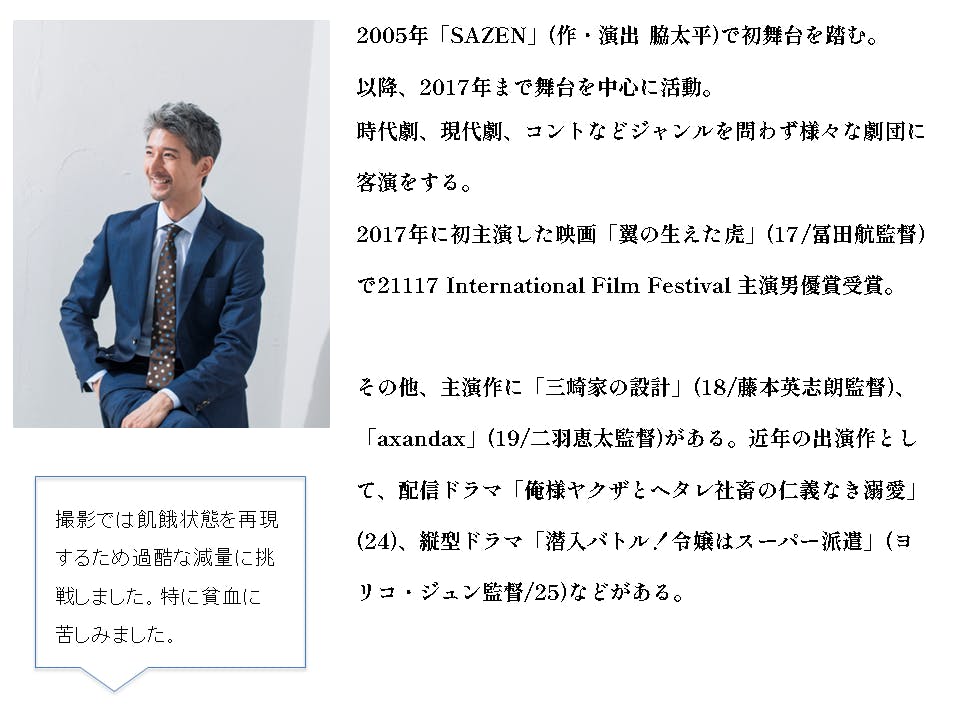 1965年、大阪府豊中市に生まれ。舞台芸術の本流を極めるべく文学座附属演劇研究所33期で研鑽を積み、東映京都俳優養成所27期。マーティン・スコセッシ監督『SILENCE』での与力役、原田眞人監督『関ヶ原』の上杉景勝、『日本のいちばん長い日』の河辺虎四郎――名匠の下で磨かれた存在感は本作でも際立つ。