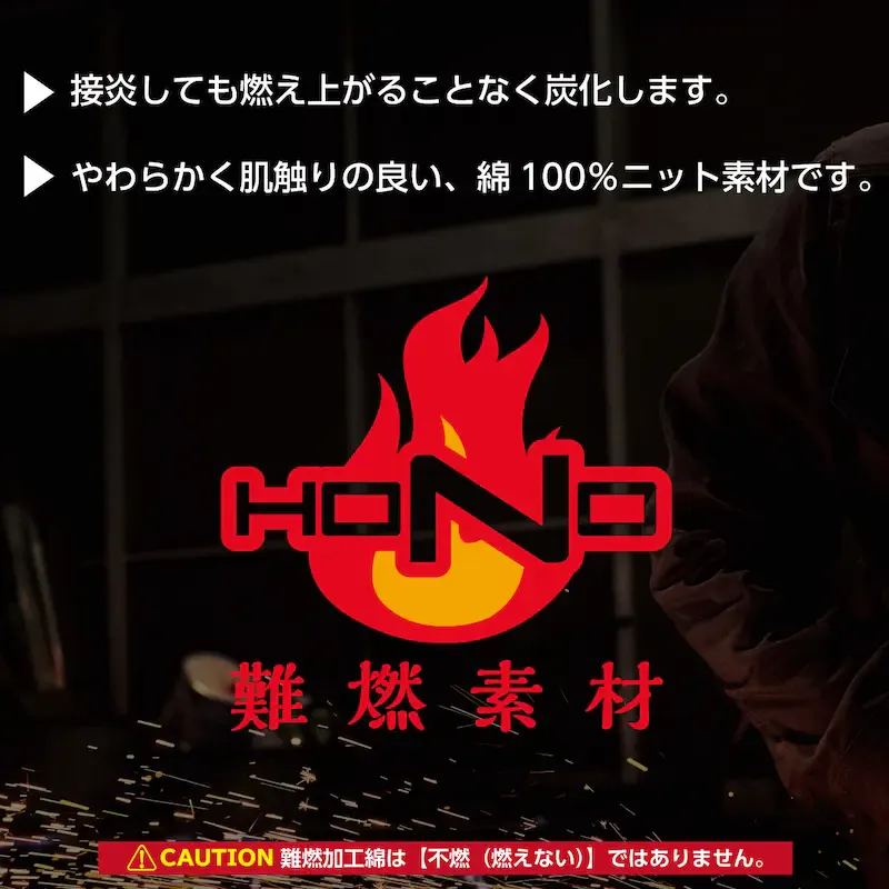 【難燃加工綿100%素材】を採用し、一般的な綿素材に比べ圧倒的に燃えにくい特性を実現。