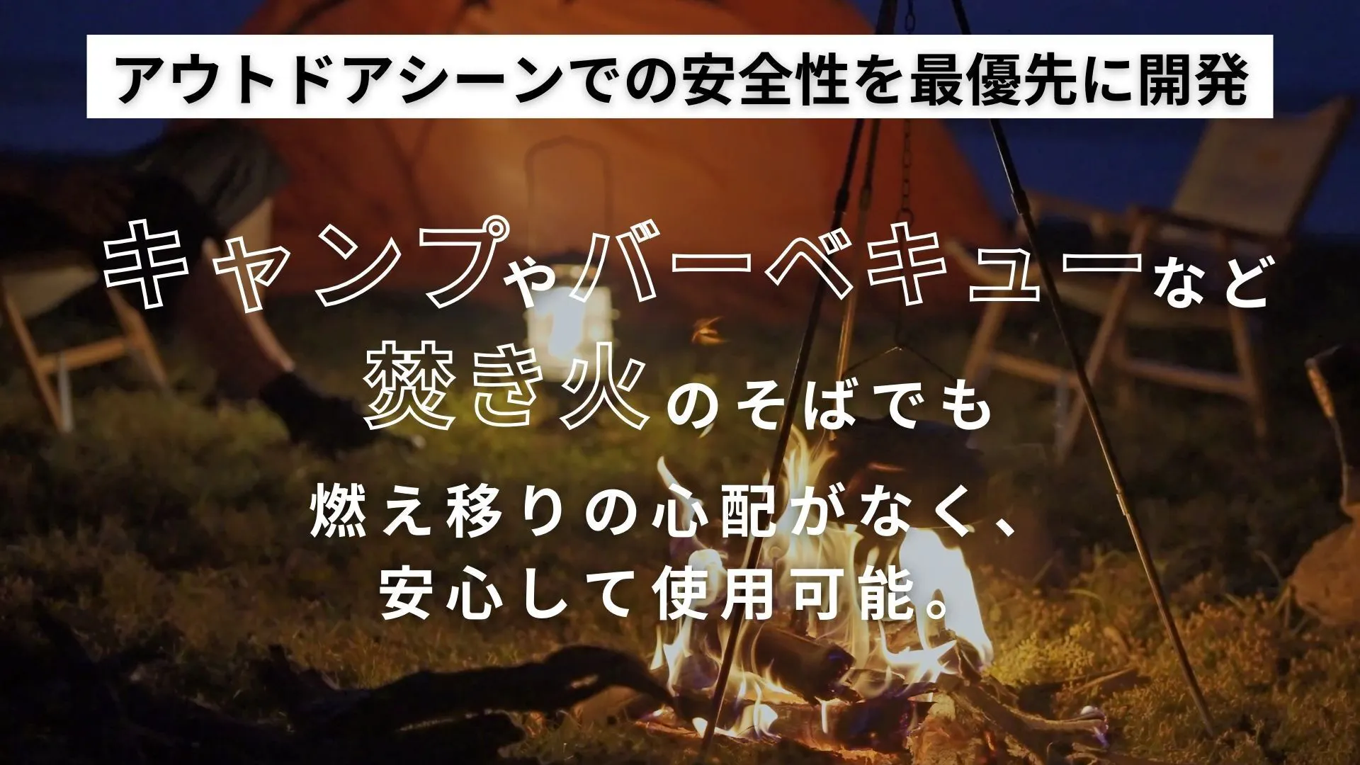 本製品は、「火気を扱う現場やキャンプなどアウトドアシーンでの安全性を最優先に開発されました。