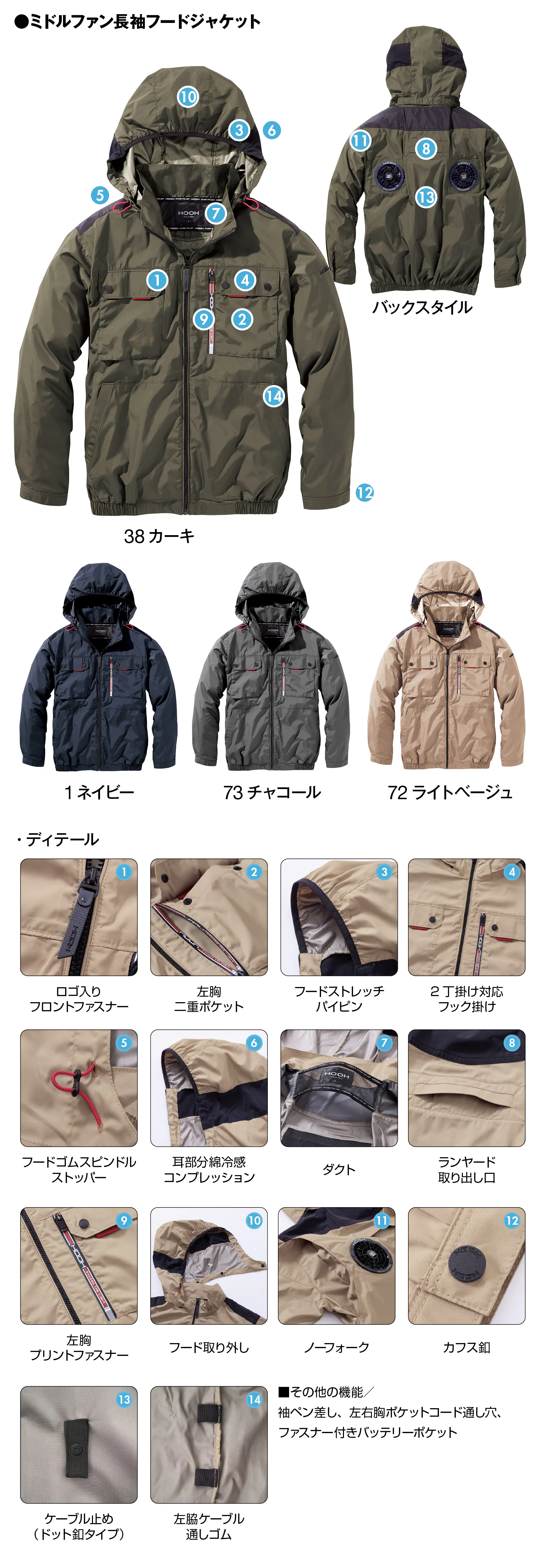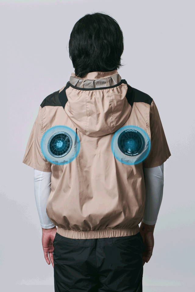 ミドルファンフードジャケット&フードベストでは、その名の通り背面のほぼ中央、肩甲骨の下あたりに2基の高性能ファンを設置。