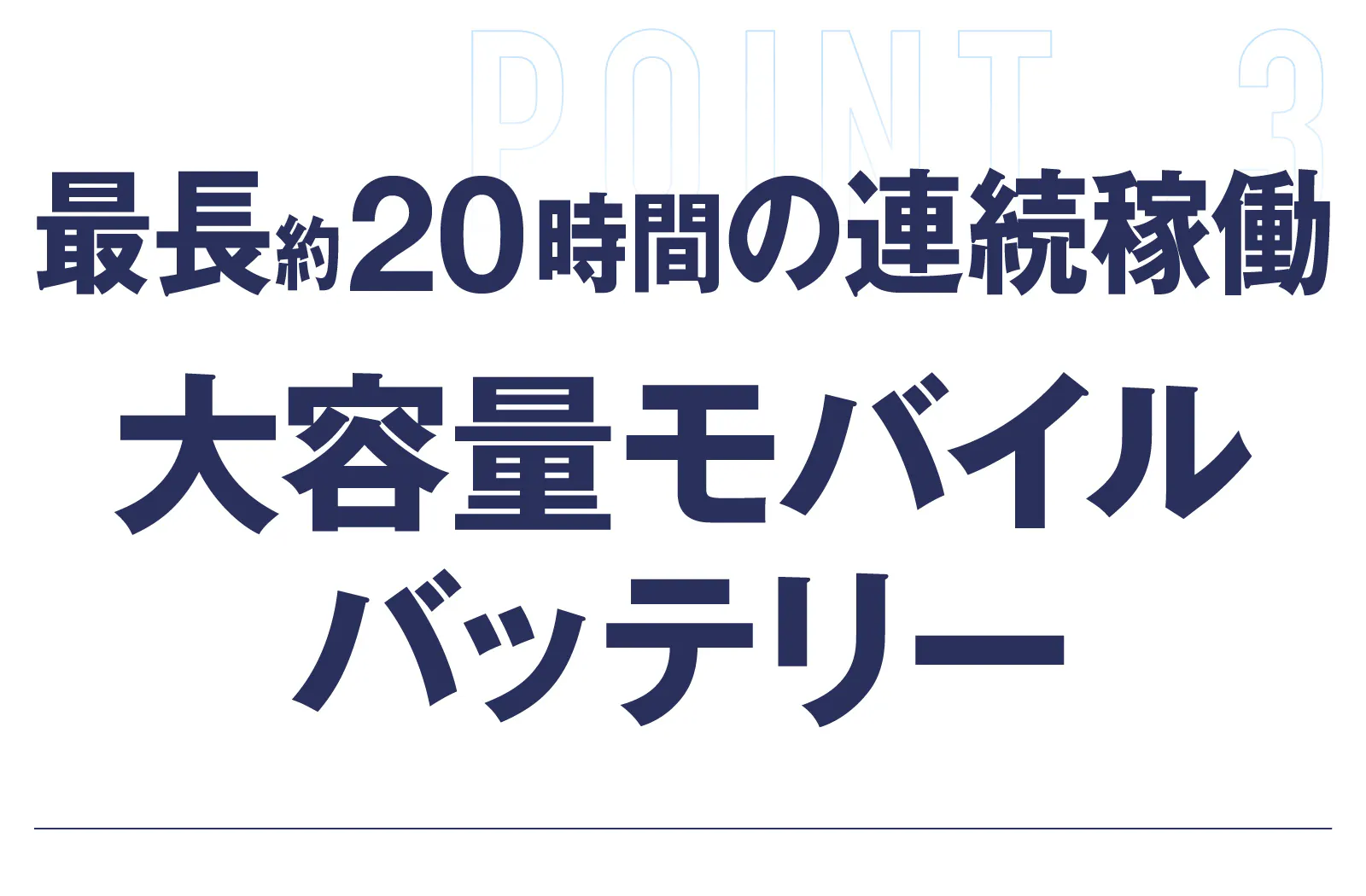 ミドルファンフードジャケット&フードベストのモバイルバッテリーは20000mAhの大容量。最長連続稼働約20時間を誇ります。