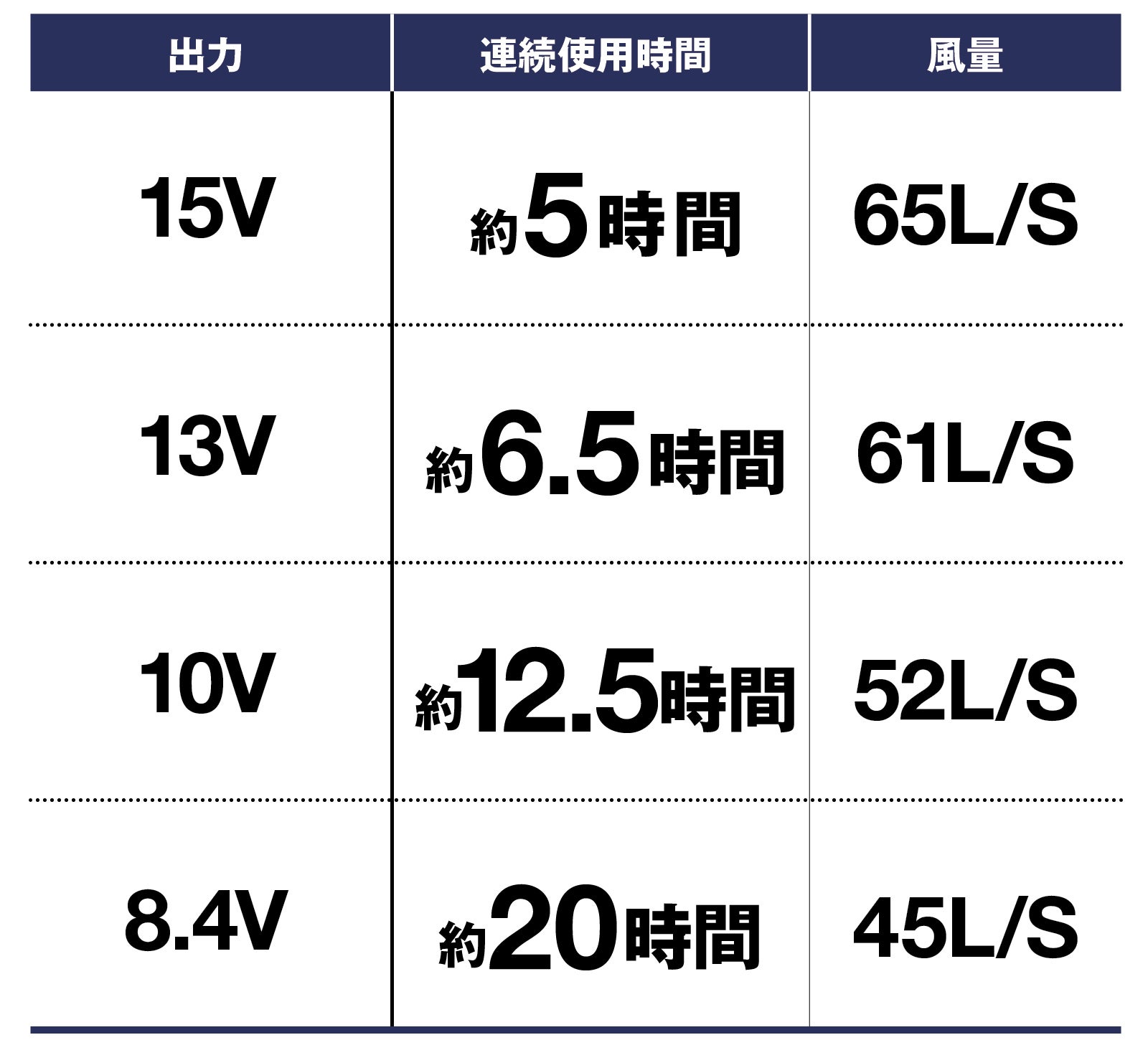 最大風量:15V/毎秒65L。最長連続稼働約20時間。