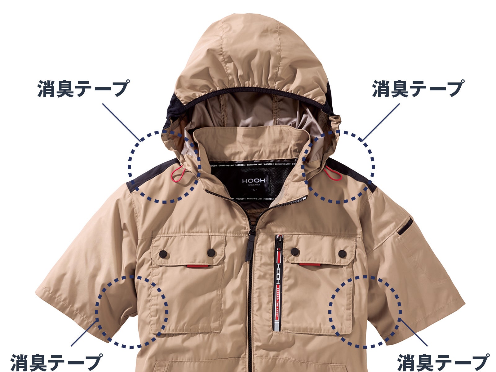 そもそもニオイは、汗で湿った状態を放置することで、雑菌が増えることにより発生します。ファン付きウェアは汗を吸湿してすぐに気化熱として放出するので、元からニオイにくいという特徴があります。その上で、首元や脇の位置に消臭テープを編み込んでいるので、ニオイ対策は万全。思い切り夏を楽しみましょう!