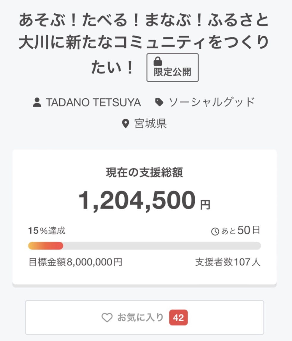 プロジェクト公開から1週間‼ 目標金額の15%(120万円)達成‼