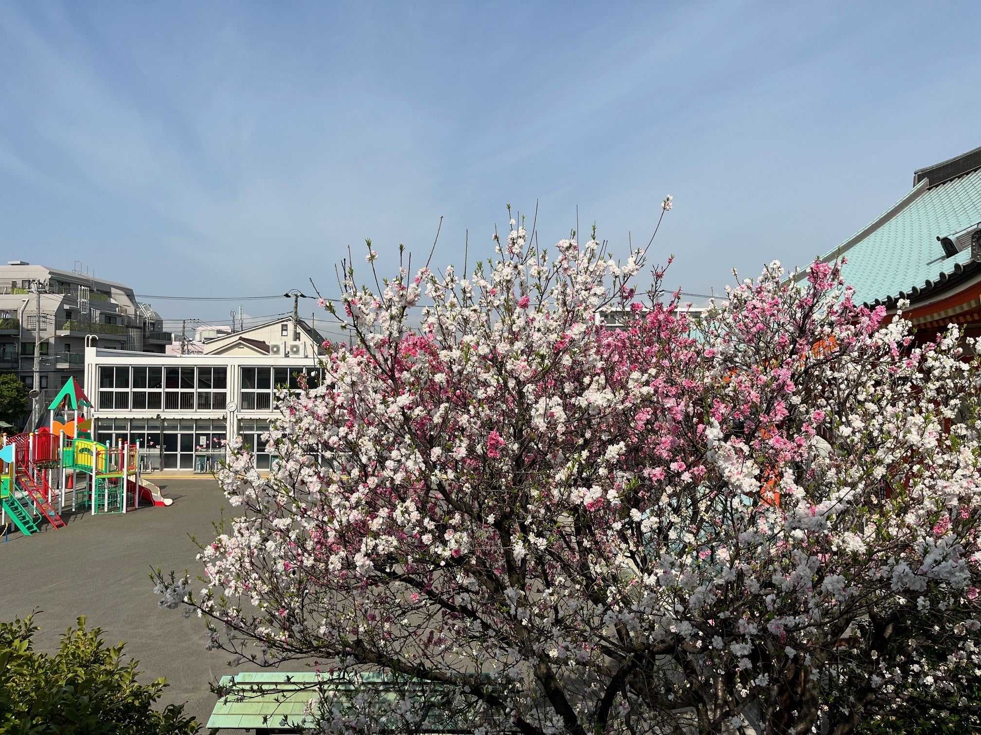 当園の園庭には紅白の花をつける桃の木があり、ちょうど今が見頃です。これから毎日通ってくる子ども達の満面の笑顔になってくれればと願い迎えたいと思います。