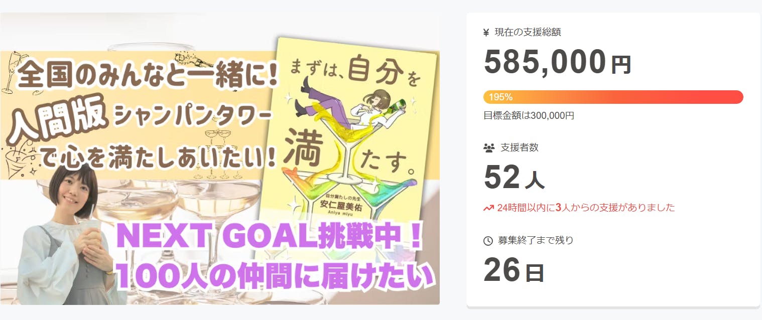 引き続き【支援者数100名様、総支援額100万円】を目指して邁進しますので、引き続き応援のほどよろしくお願いします★