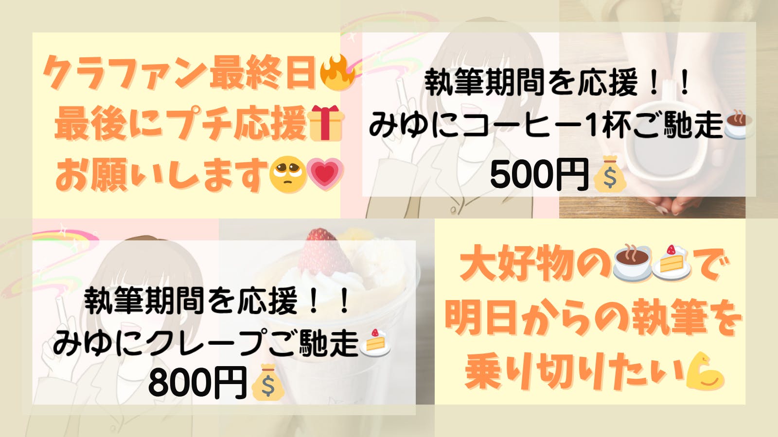 そこで!!「執筆期間のみゆをコーヒーとクレープで応援する権利」を最終日に追加させていただきました★