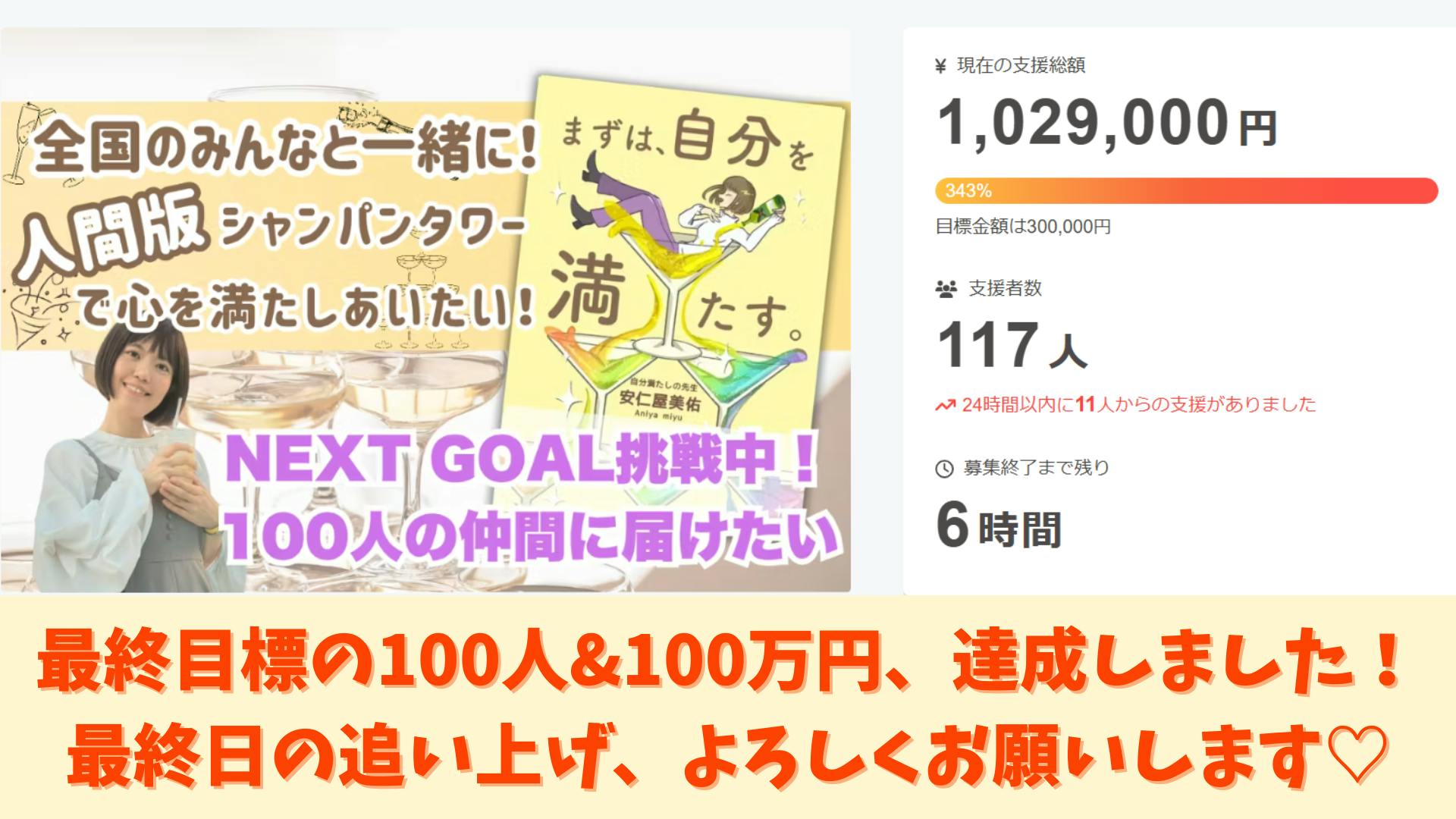 実は昨夜、最終目標に掲げていた【100名&100万円】を達成しました!!