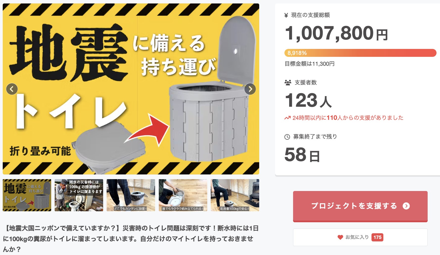 開始1日で早くも100万円を達成しました!皆さまの防災意識の高まりを感じることができ、とても安心しています。割引率の高いリターンには数に限りがありますので、ご検討中の方はお早めにどうぞ!