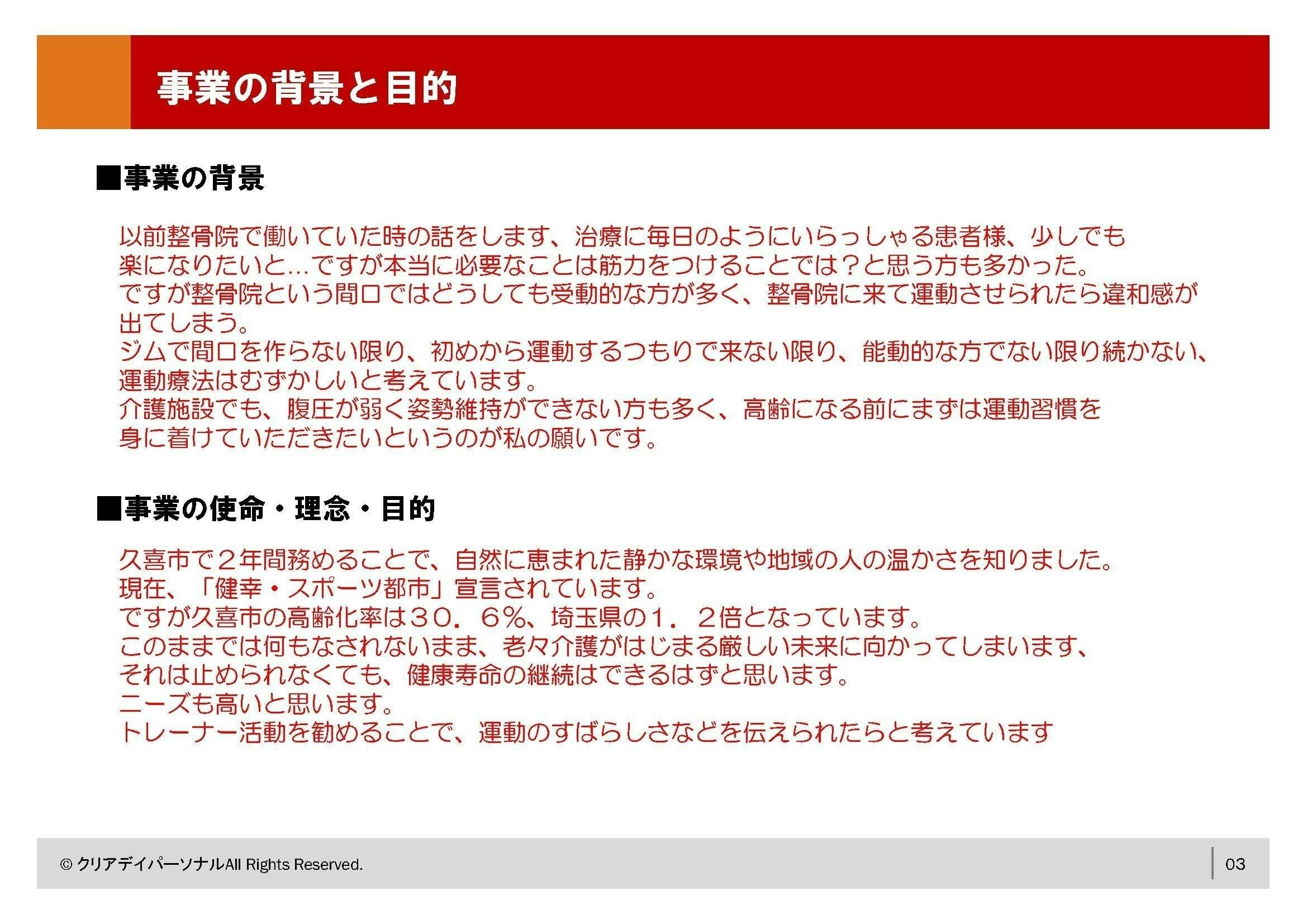 私たち「クリアデイパーソナル」は、フィットネスと健康を愛し、その価値を広めることを使命としています。これまで、地域の方々と密接に関わり、様々なフィットネスプログラムを提供してきました。今回、久喜駅西口に新たなパーソナルト:ーニングジムをオープンし、より個別化されたトレーニング体験を提供することで、地域の健康をさらに向上させたいと考えています。