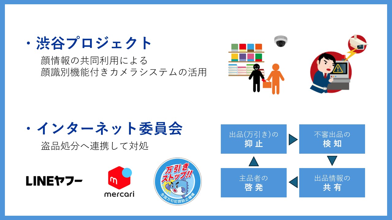 万引き犯罪は出来心からやってしまったという人のほか、近年は常習者、さらには犯罪グループによる大規模な組織犯罪まで様々です。また、盗品の処分もネットオークションやフリマサイトへと移行しています。このため、私たちは上記の活動のほかにも、「渋谷書店万引対策共同プロジェクト」を立ち上げ、顔情報の共同利用を進めたり、EC運用事業者と共に「インターネット委員会」を設置し、アカウント停止や啓発メールを発信しています。
