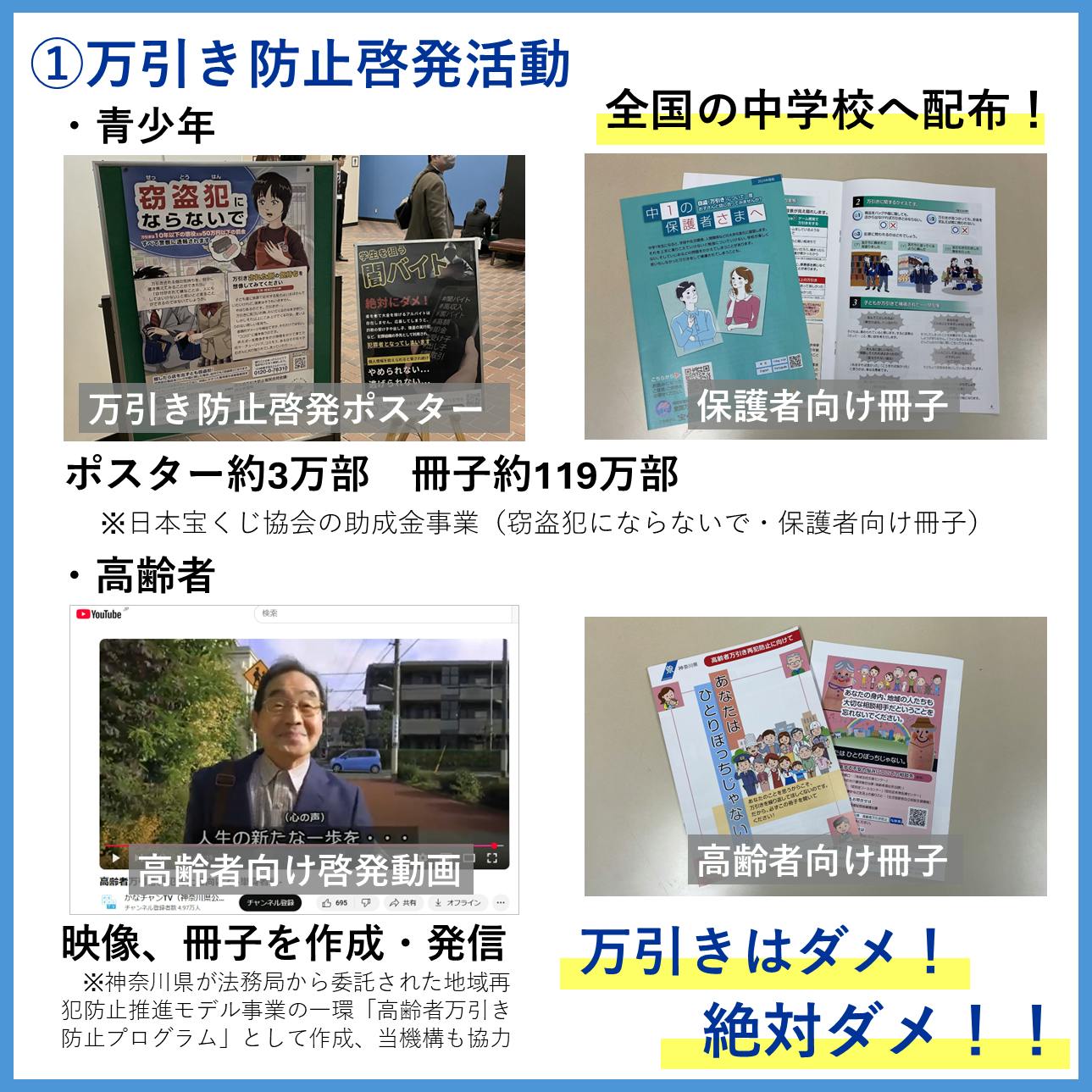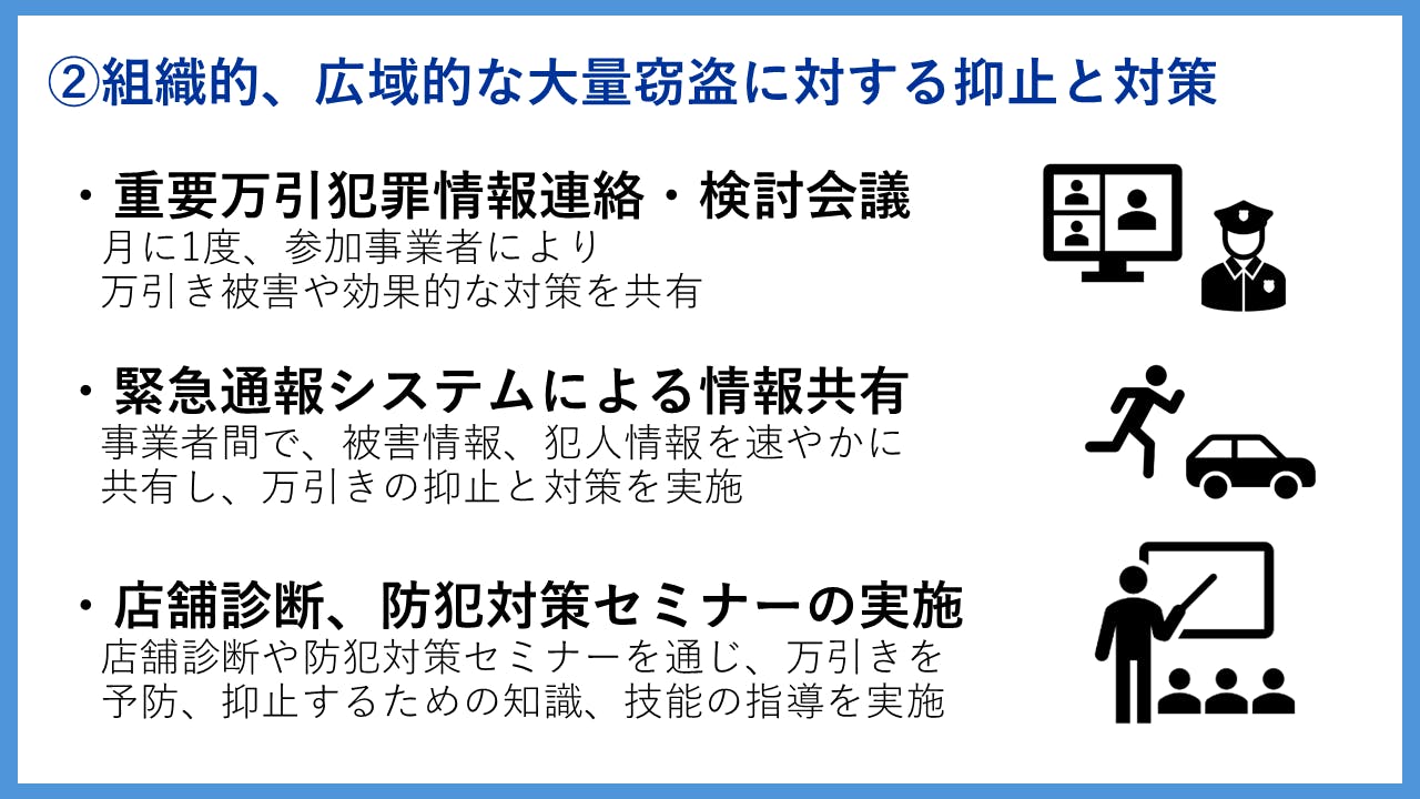 当機構の活動の大きな柱は「万引き防止啓発活動」と「組織的、広域的な大量万引きに対する抑止と対策」の2つです。
