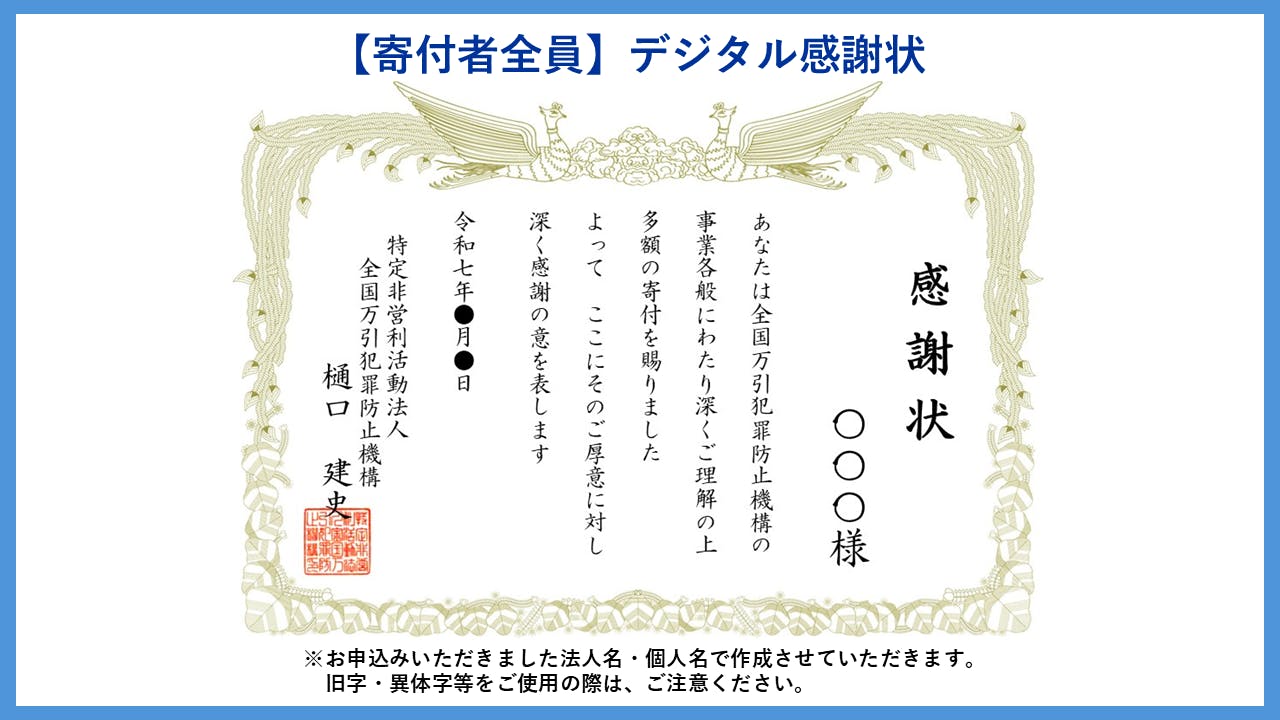 ぜひ、当機構の様々な活動にご協力をいただき、安心安全な社会づくりへの支援をお願いいたします。