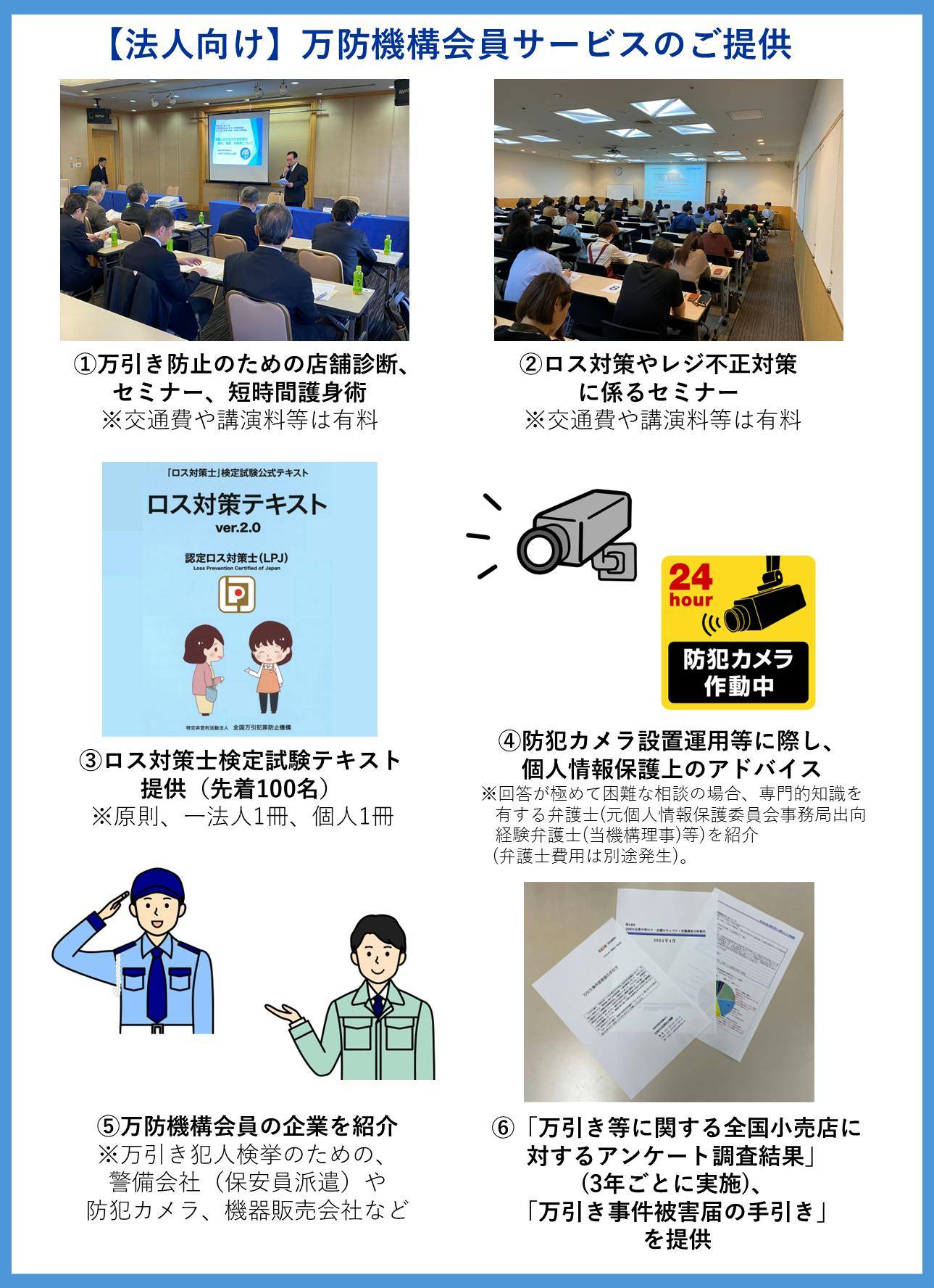 また、万引き防止のプラットフォームとなるべく、会員などの事業者同士の交流やマッチング、関係各所への万引き防止に向けた建議提言も実施しています。