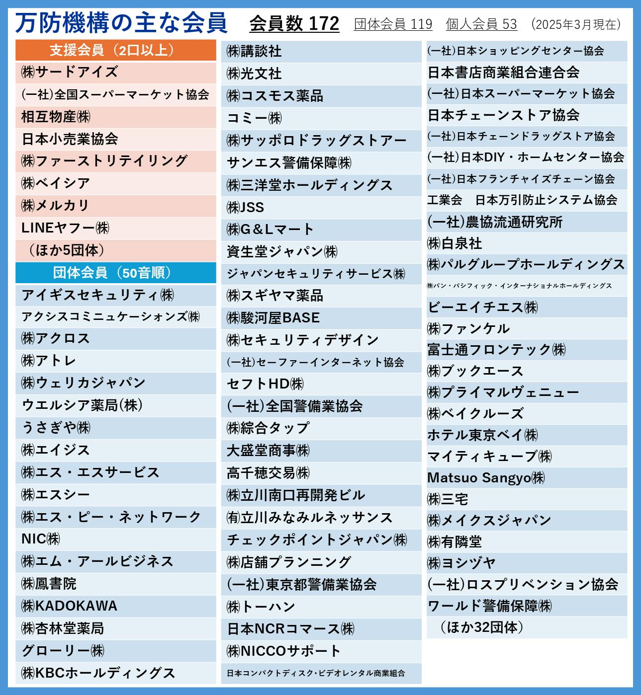 当機構はこれまで、万引き対策全般において警察と連携し、さまざまな対策を実施してまいりました。しかし、新たな万引き(組織窃盗・職業的窃盗)に迅速かつ効果的に対応するための対策を、すべての小売業者に参加していただくには至っておりません。2025年3月時点で、個人会員は53名、団体会員は119団体です。