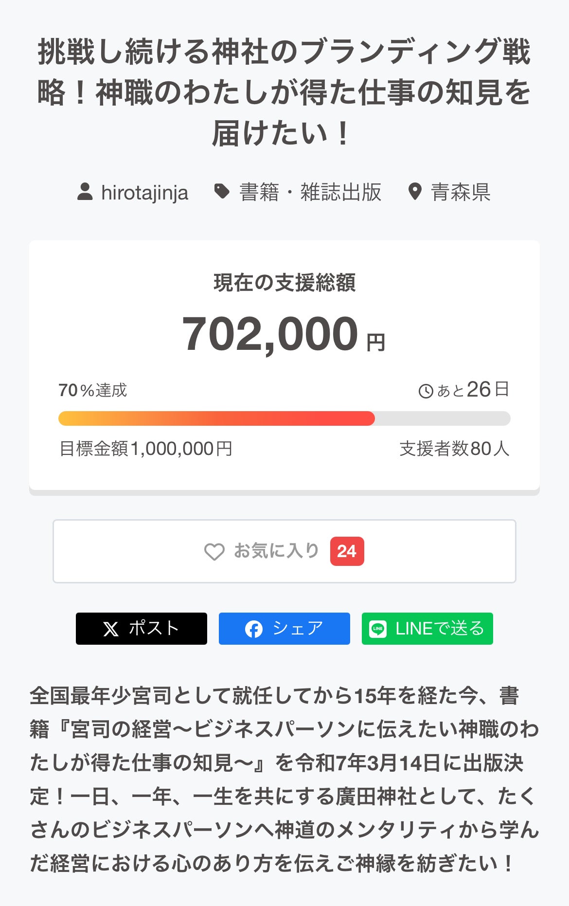 皆様の心温まるご支援・ご協力、感謝いたします。今日は第2章を紹介します!【宮司の仕事とは|宮司さんって何しているの?】⛩ 私が「宮司になろう」と思ったきっかけ⛩ 宮司の一日⛩ 神社経営の現実⛩ 宮司と経営者の共通点⛩ 伝統と革新⛩ 神道的リーダーシップ⛩ 自然信仰とサステナブル経営この章では、まずはじめに、そもそも私が宮司になろうと思ったきっかけから、宮司を拝命するという使命感と覚悟を決めたお話させていただきました。次に、宮司って一日なんの仕事をしているの?と想像がつかない方も多いかと思いますので、私が普段している奉仕、仕事について紹介しました。それを踏まえて、神社を維持するということが如何に難しいことであり、現実として起きていることを記しました。そうした中で、現代の宮司という立場と経営者という立場は、ただ単に聖と俗という関係ではなくむしろ共通する仕事が沢山あり、如何に経営的な発想も必要かということを書きました。一千年続いてきた神社をこれからの一千年に残していくためには、伝統を守りながら現代にも沿った革新的な取り組みが必要なこと、そしてその為には従業員や仲間が重要であり、先導していく上での大切ことを紹介しています。最後は、これからどのような持続可能な経営が求めらえれていくのかを、神道の原点でもある自然信仰をもとに示しました。ぜひ、お楽しみに!!