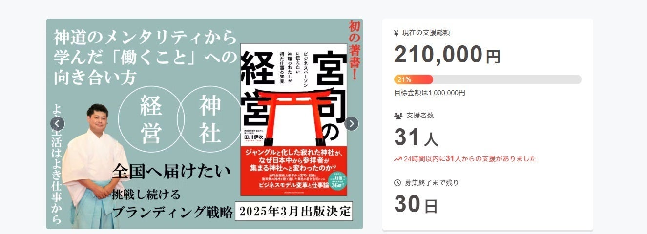皆様の厚いご支援、ご協力ありがとうございます。今回は私についてどんなことをやってきたのか、書籍に掲載されている略歴をもとに紹介させていただきます!現在、私は青森県青森市、県庁近くに鎮座する病厄除守護神 廣田神社の第17代宮司を拝命しております。昭和61年生まれ。38歳寅年の五黄土星です。スポーツで有名な青森山田高等学校を卒業後(私はバレーボール部)、國學院大學神道文化学部入学。空手道部や学生アドバイザーという学生広報サークルに励み、無事卒業!神奈川県鎮座の寒川神社に奉職。その後、先代の急逝により急遽青森へ帰ることに。若干23歳にして全国最年少で廣田神社(青森県青森市)宮司に就任し、神職としての改革を積極的に推進。就任後、数百年ぶりに御神輿渡御の神幸祭を復活させたり、節分祭を県内最大規模に再興させたりするなど、地域文化と伝統の継承に尽力してきました。また、天皇皇后両陛下のパラオ共和国慰霊訪問時には奉迎手旗入魂祭を斎行し、パラオ戦没者慰霊祭を神仏合同で執り行い、慰霊と共に戦跡の保存事業に協力するなど、国際的にも活動し注目を集める。また他宗教との交流も積極的に推進。祈りと音楽をテーマに東北初の宗教音楽フェスを開催したり、神仏合同の津軽龍神霊場会の立ち上げに参画したり、神道のもつ寛容と共生の世界を実現。SNSを活用し、コロナ禍の際にはお参り叶わなくとも、人々との繋がりを紡ぐために全国初のInstagram神社コラボライブ配信を企画実施するなど、伝統と現代技術を融合させた活動を展開。また、早い時期よりクラウドファンディングを積極的に導入し、累計1,000万円以上の支援を集め、八甲田連峰高田大岳頂上にある八甲田山神社の祠再建や境内の各種整備を実現させました。また、高齢化社会におけるお墓の後継問題解決の一つのあり方として、神道の永代供養に取り組み、海洋散骨や合葬墓に取り組み、いつでもご先祖様にお参りできる祖霊社を創建。こうした取り組みにより、宮司就任から15年で神社の年間収入を6倍に増収させ、参拝者数は36倍に増加させできました。一日、一年、一生に寄り添う廣田神社として、護持運営のために収入を上げる経営はもちろん、神道のメンタリティによる幸せな生き方や社会を実現するべく、信仰を育む教化を行っています。そうした経験から皆様へお伝えしたいことを今回の著書では書かせていただきました。ぜひ、ビジネスとは関係ない方でも楽しんで日頃に活かしていただける内容も記載されておりますのでお楽しみに!