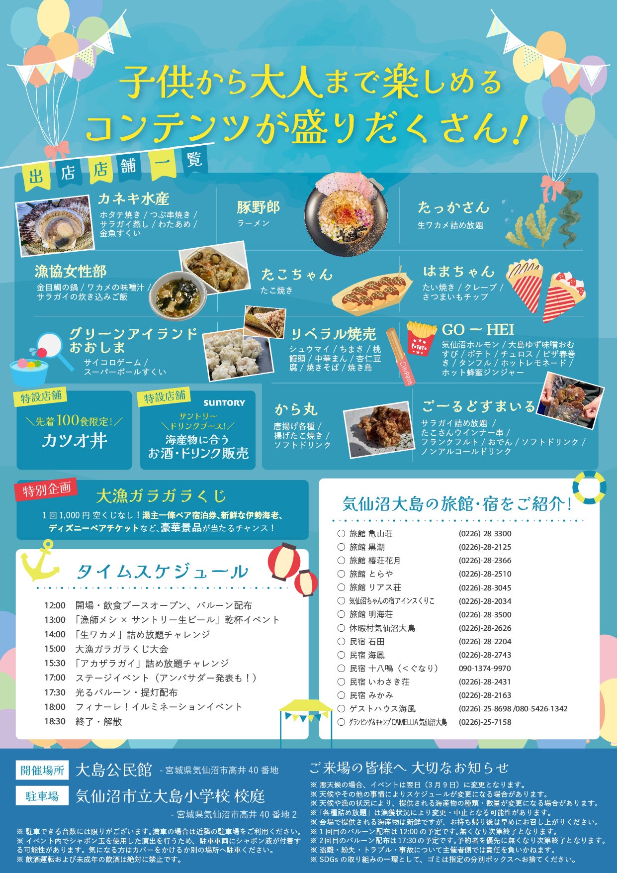| 駐車場 | 気仙沼市立大島小学校 (宮城県気仙沼市高井40番地2) ※駐車できる台数には限りがある為、満車の場合は近隣の駐車場をご利用ください。 ※イベント内でシャボン玉を使用した演出を行う為、駐車車両にシャボン液が付着する可能性があります。 気になる方はカバーをかけるか、別の場所へ駐車ください。 ※飲酒運転および未成年の飲酒は絶対に禁止です。 |