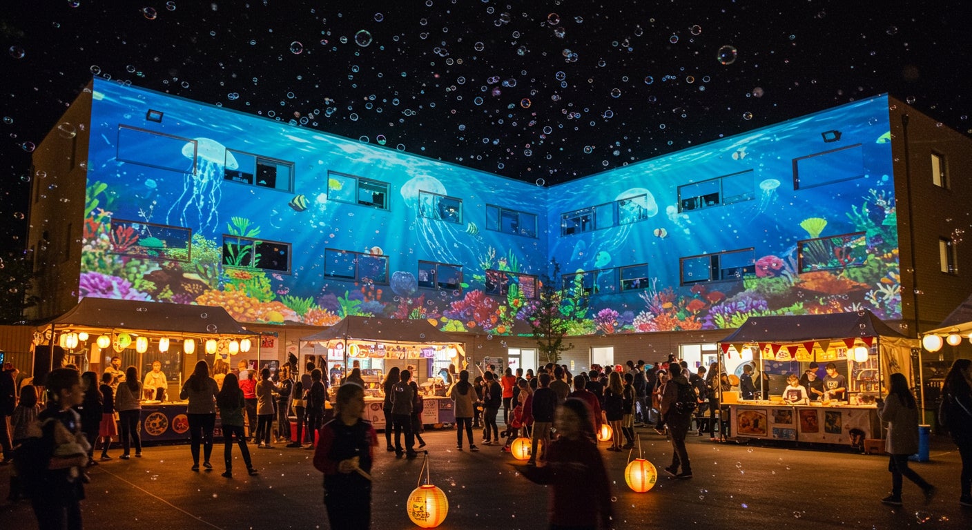 イベントの最後にフィナーレとして、シャボン玉やプロジェクター投影、さらに光る風船で会場を彩るイルミネーション演出を行います。