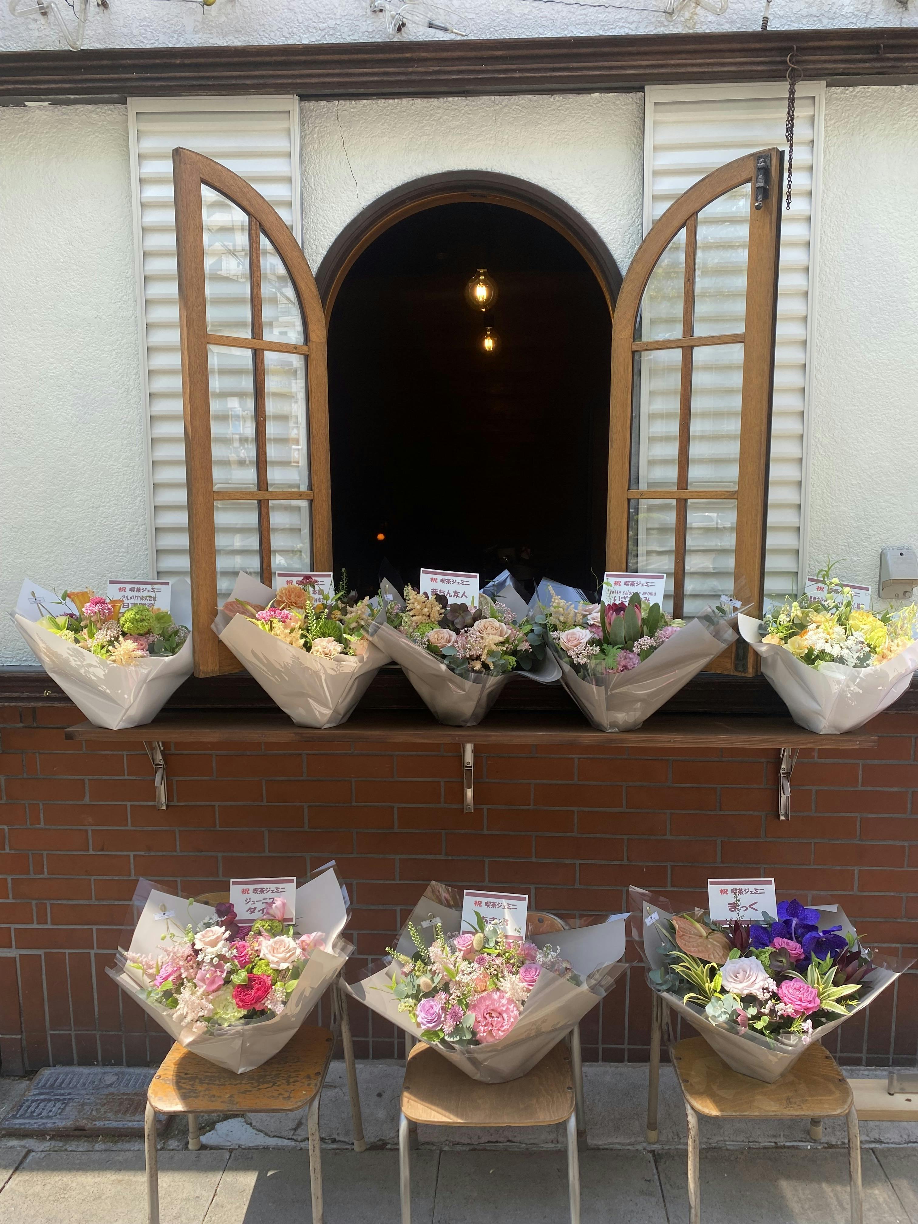 当日は、店先や店内にたくさんのお花を飾っていただき、とても華やかで、胸がいっぱいになりました。アレンジ花、スタンド花のご支援くださった皆さま、本当にありがとうございました。